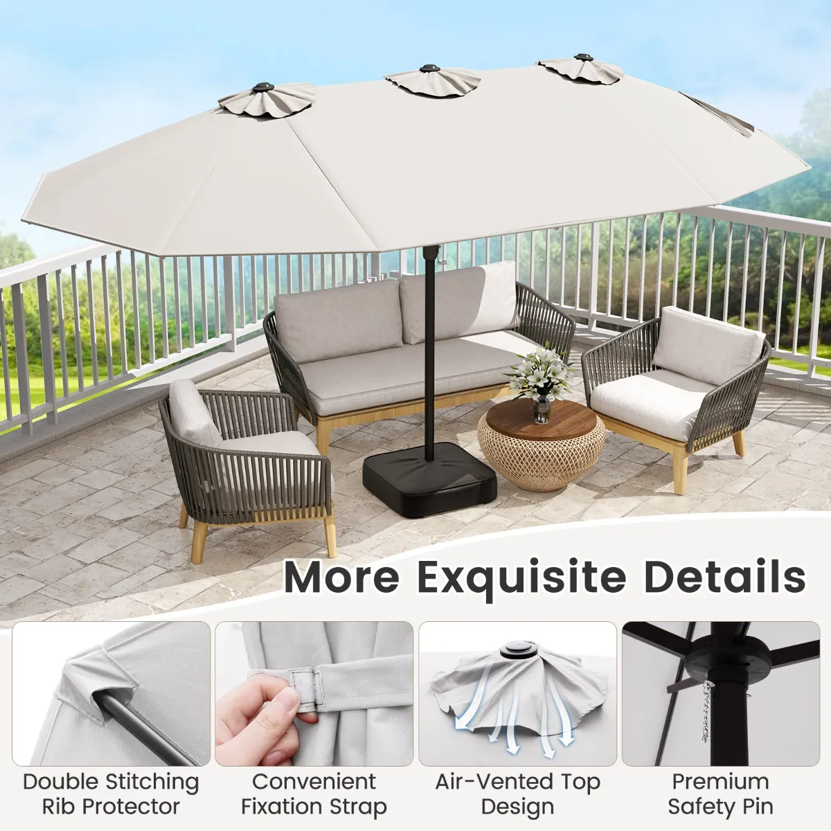 Dubbele Terrasparasol Grote Parasol Voor Buiten 12 Metalen Baleinen Stabiele Basis 2 Gewichtszakken Geventileerde Bovenkant Zwengel-Beige