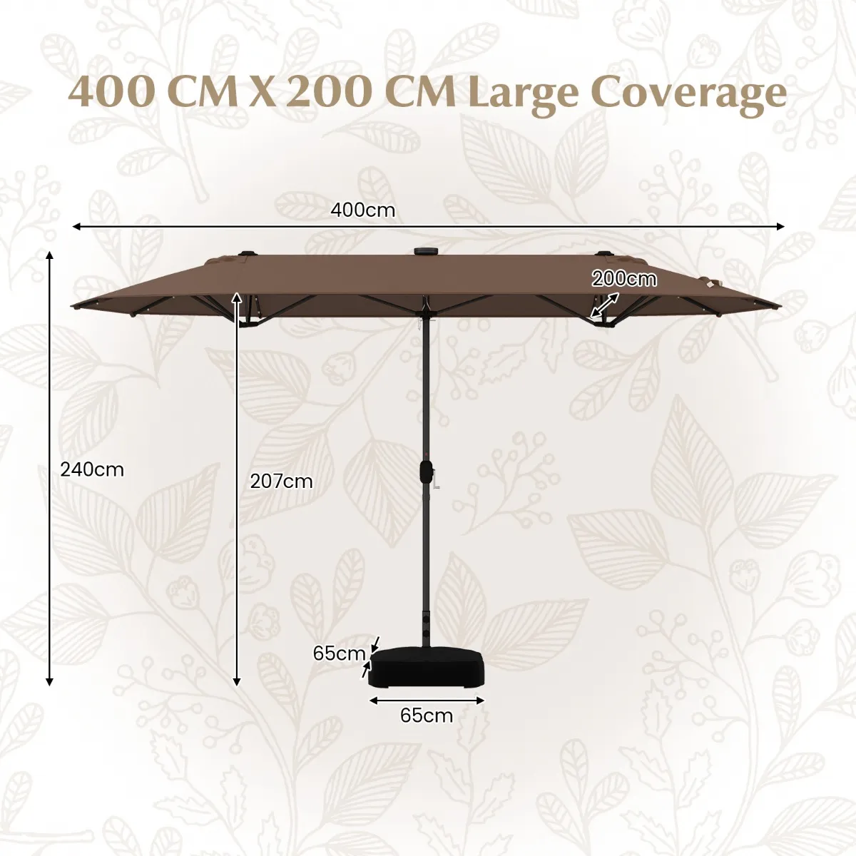 【Grote schaduwruimte】 Met een grote dekking van 400 x 200 cm belooft de dubbelzijdige buitenparasol gemakkelijk uw grootste bijeenkomsten te beschermen. En de parasol met verlichting is uitgerust met ventilatieopeningen om een koel toevluchtsoord te creëren in uw tuin, terras, tuin of bij het zwembad.