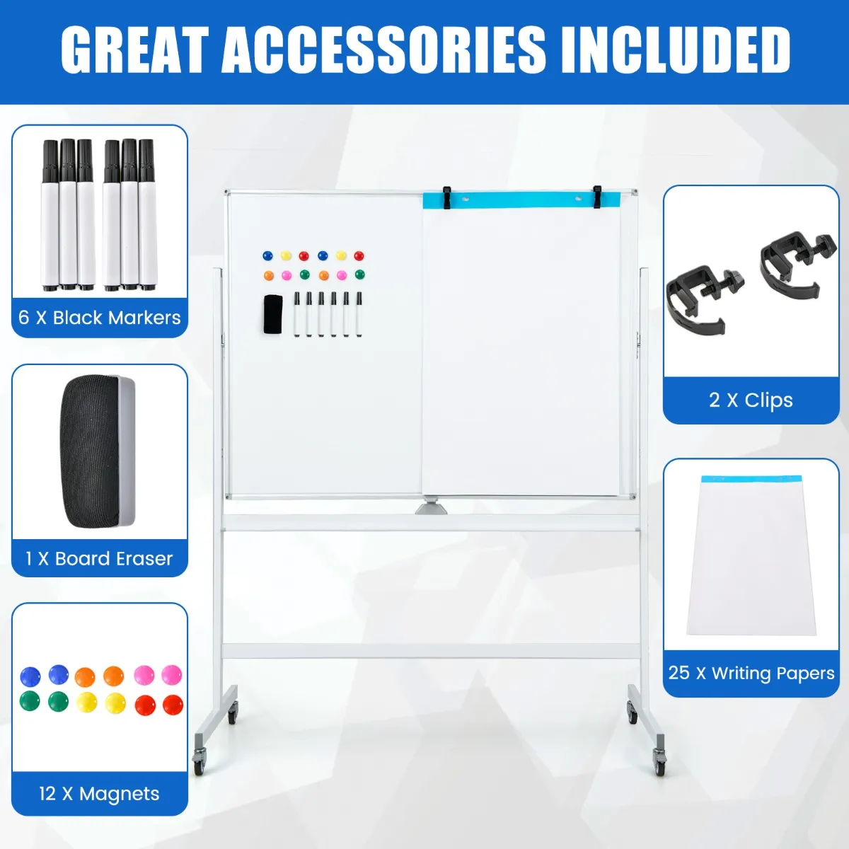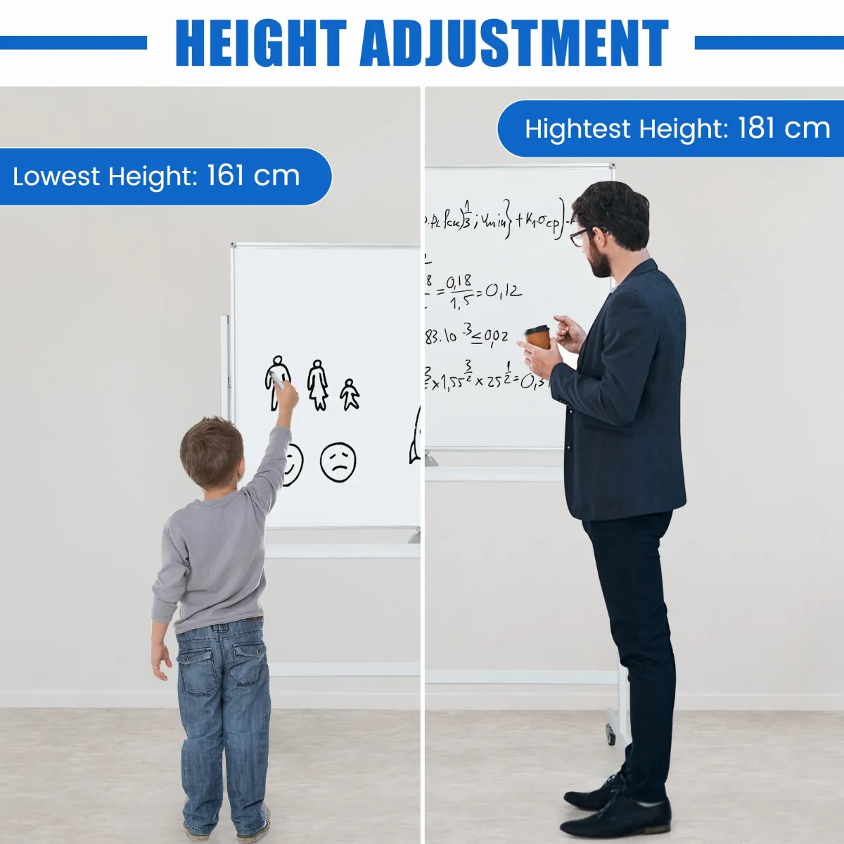 Dit dubbelzijdige whiteboard is geschikt voor zowel volwassenen als kinderen en wordt een onmisbaar hulpmiddel voor onderwijs, presentaties en meer. Dankzij de verstelbare hoogte is dit whiteboard geschikt voor gebruikers van verschillende leeftijden, of het nu voor volwassenen of kinderen is. Voor extra comfort is het whiteboard uitgerust met een markeerplank, zodat je markeerders georganiseerd en binnen handbereik blijven. Bovendien zijn in deze levering 6 zwarte markers, 1 bordwisser inbegrepen, 12 magneten, 2 clips, 25 vellen schrijfpapier en 2 installatiegereedschappen. Met deze uitgebreide set heb je alles wat je nodig hebt om direct aan de slag te gaan. Niet in de laatste plaats is het whiteboard uitgerust met 4 vergrendelbare wielen om een uitstekende mobiliteit en stabiliteit tijdens het gebruik te garanderen.