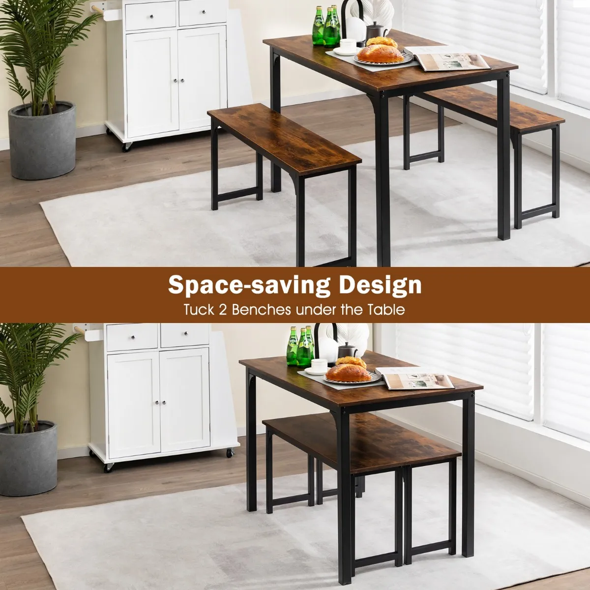 【3-delige eettafelset】 De 3-delige eettafelset bestaat uit 1 eettafel en 2 banken die ruimte bieden voor 2-4 personen, zodat je met je gezin kunt genieten van heerlijke eet- en drinktijden of vrienden thuis van verfrissingen kunt voorzien.