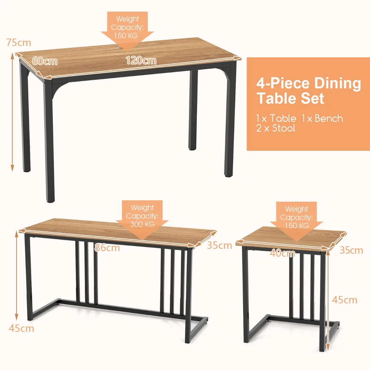 Onze 4-delige eettafelset bestaat uit een grote rechthoekige tafel, een bank en 2 krukken en biedt meer ruimte en comfort, terwijl je met je gezin geniet van een heerlijk drankje of vrienden thuis met verfrissingen verwent. Het verdikte tafelblad bestaat uit hoogwaardige MDF-plaat, die krasbestendig en waterdicht is en een eenvoudige reiniging mogelijk maakt. In combinatie met een industriële look en een moderne stijl kan hij probleemloos in je huis of andere plaatsen worden geïntegreerd.
