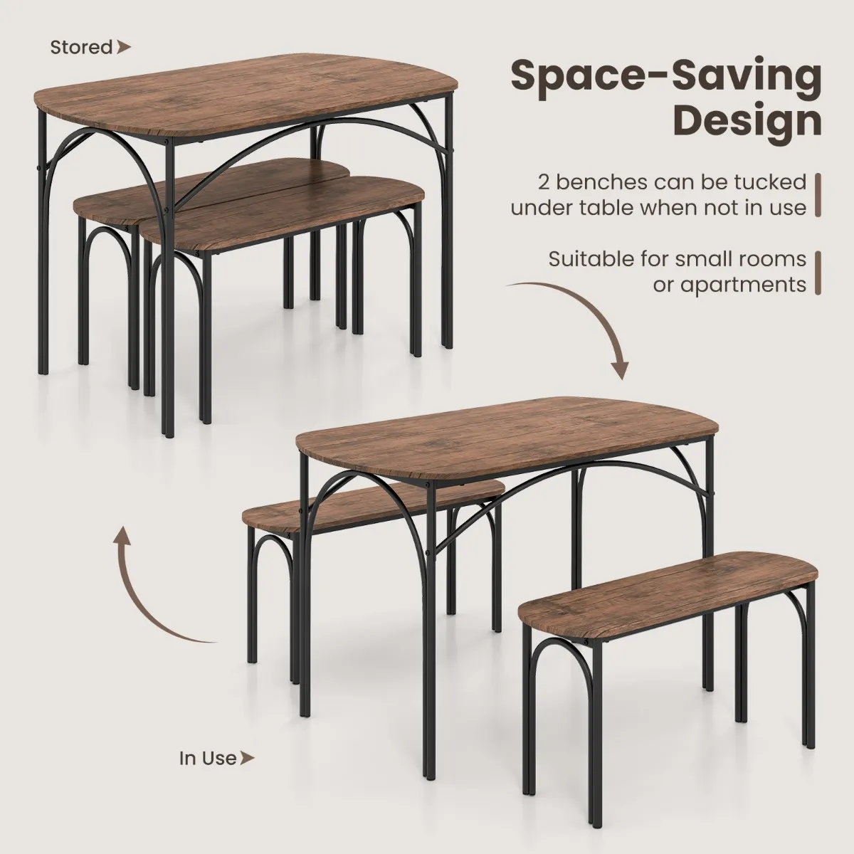 【Ruimtebesparend ontwerp】: De 2 banken kunnen onder de tafel worden opgeborgen wanneer ze niet worden gebruikt, waardoor u waardevolle vloerruimte bespaart. Dankzij het compacte ontwerp is de set geschikt voor gebruik in appartementen, keukens en andere beperkte ruimtes.