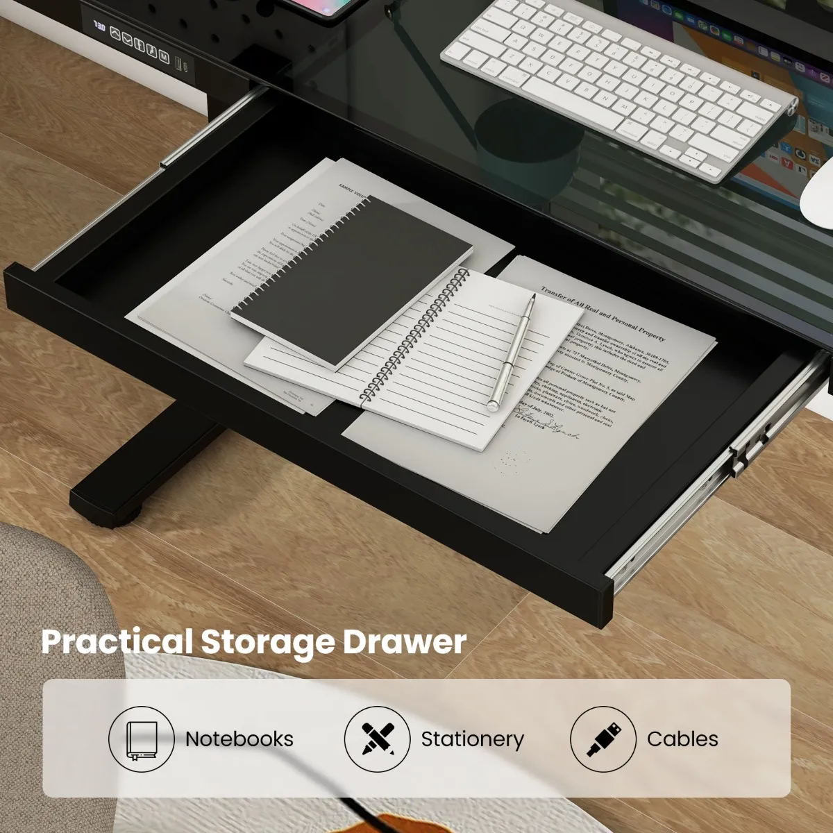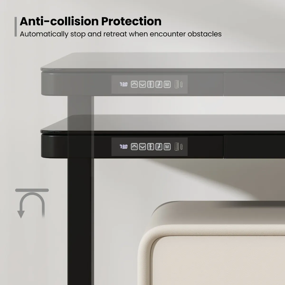 Dit innovatieve elektrische sta bureau biedt gemak en stijl. Het heeft een elegant blad van gehard glas van 120 cm dat waterdicht, krasbestendig en beschrijfbaar is met een uitwisbare stift. Schakel eenvoudig van zitten naar staan dankzij de verstelbare hoogte-instellingen. Op het bedieningspaneel kun je de hoogte instellen met een digitaal display. Laad je apparaten op vanaf het bureau met de geïntegreerde USB- en Type-C-poorten. De gladde lade houdt je benodigdheden binnen handbereik en een anti-crash mechanisme beschermt je omgeving tegen stoten.