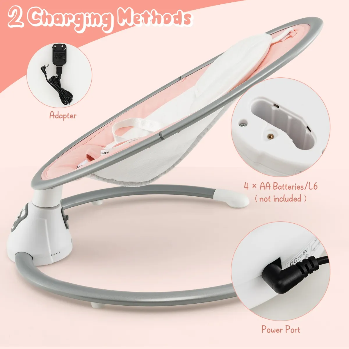 Ontwerp met dubbele bediening: Deze babyschommel is uitgerust met een bedieningspaneel en een afstandsbediening voor eenvoudige bediening. De afstandsbediening heeft een bereik van 3 m en de batterij is inbegrepen. Naast de standaardadapter kan de schommel ook worden gevoed door 4 AA-batterijen (niet inbegrepen).