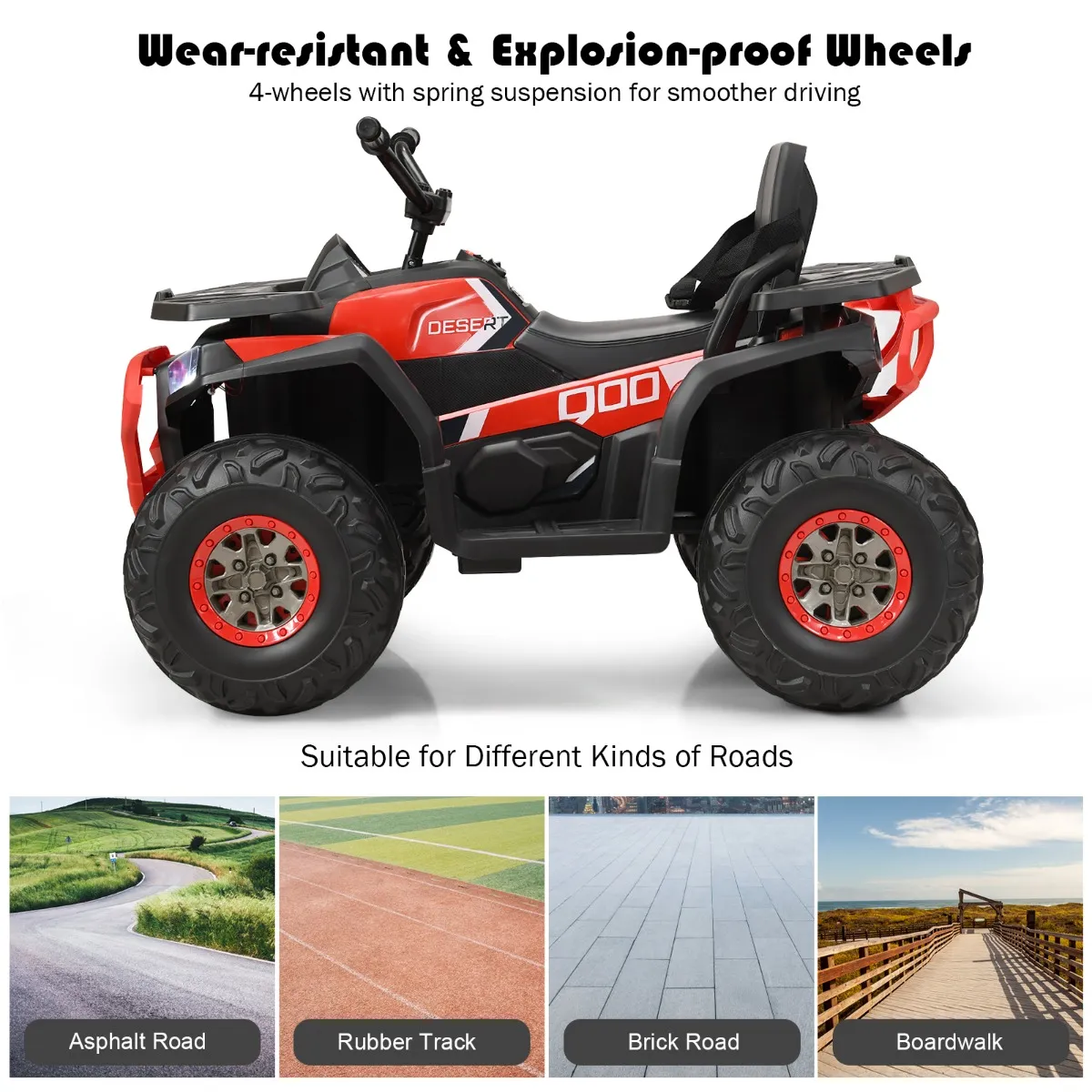 Kinderen kunnen de auto eenvoudig bedienen via de hoge/lage snelheidsschakelaar en de vooruit/achteruitschakelaar. En het voetpedaal en het stuur helpen kinderen de snelheid en richting van de auto beter te beheersen. Geïntegreerde muziek en verhalen zorgen voor extra rijplezier. Je kunt ook externe apparaten aansluiten op de USB-sleuf en AUX-ingang, zodat je kind naar zijn favoriete muziek, verhalen en meer kan luisteren. Bovendien verlichten gloeiende LED-lampen de omgeving in het donker en zorgen ze voor een realistische ATV-ervaring! Vermeldenswaard is dat deze terreinwagen beschikt over een comfortabele stoel met veiligheidsgordel en vierwielophanging, zodat jouw kleintje de beste bescherming krijgt. Uw kinderen kunnen er vakkundig mee rijden, of het nu op de houten vloer, op de betonweg of op andere plaatsen is.