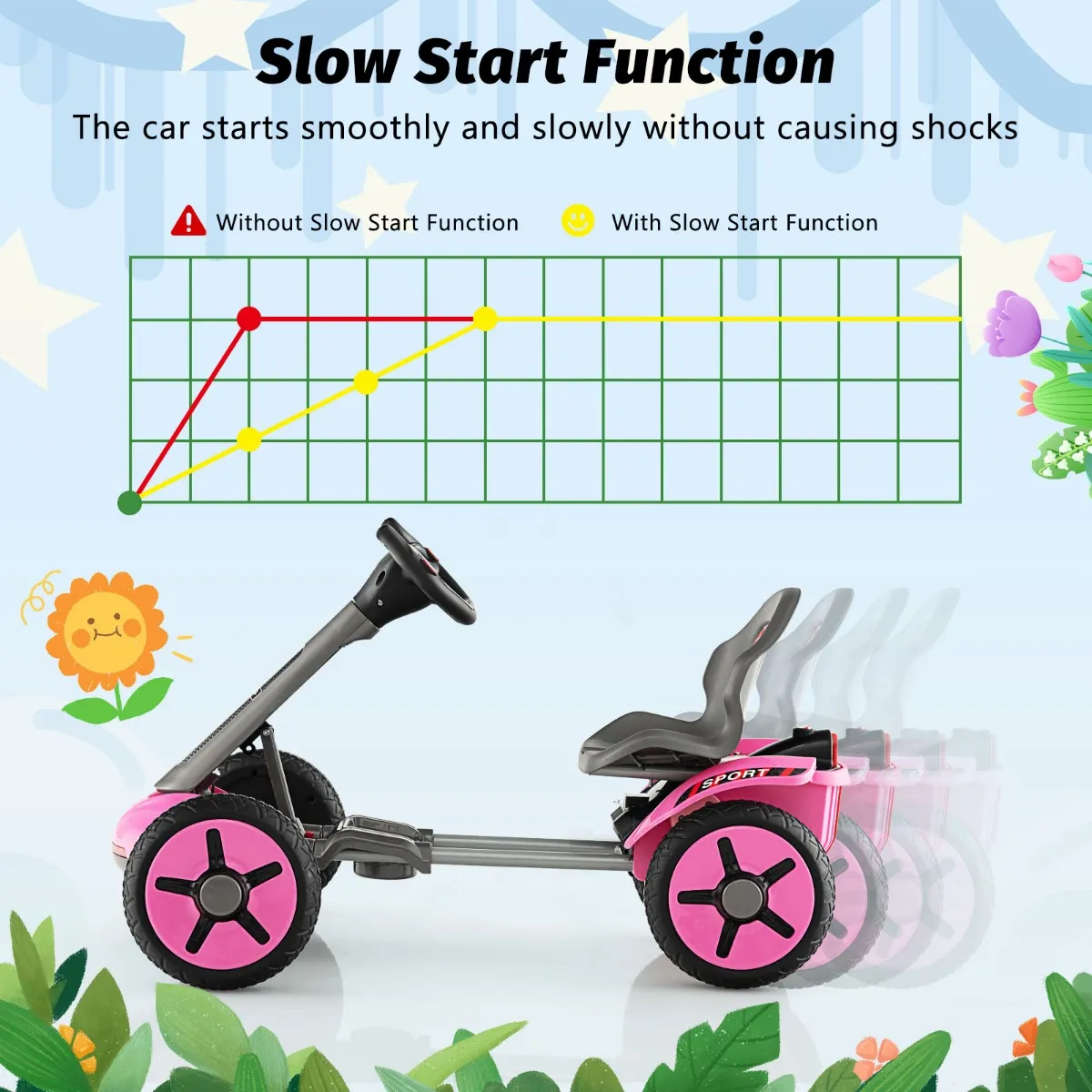 Veilige en soepele rijervaring- De langzame startfunctie voorkomt plotselinge versnellingen en beschermt zo de veiligheid van het kind. Een veilige rugleuning voorkomt te ver achterover leunen. Bovendien maken 4 hoogwaardige banden een soepele beweging op betonnen wegen, bakstenen wegen of houten vloeren mogelijk.