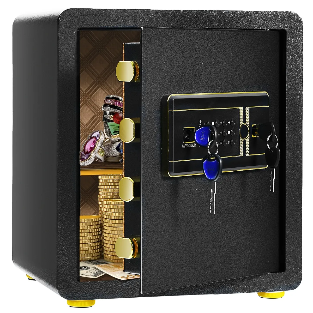 Veilige & Duurzame staalconstructie: Gemaakt van wrikbestendig koolstofstructuurstaal, verzekert deze veilige box grote stevigheid en langdurige duurzaamheid. Bovendien beschikt de veilige veiligheidskluis ook over 4 stevige echte deurbouten en een dik deurpaneel om uitstekende veilige prestaties te bieden.