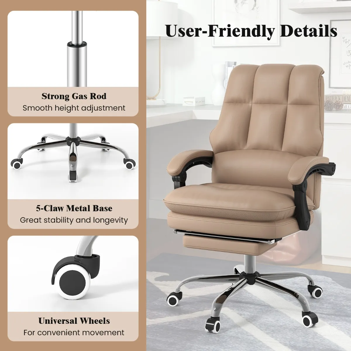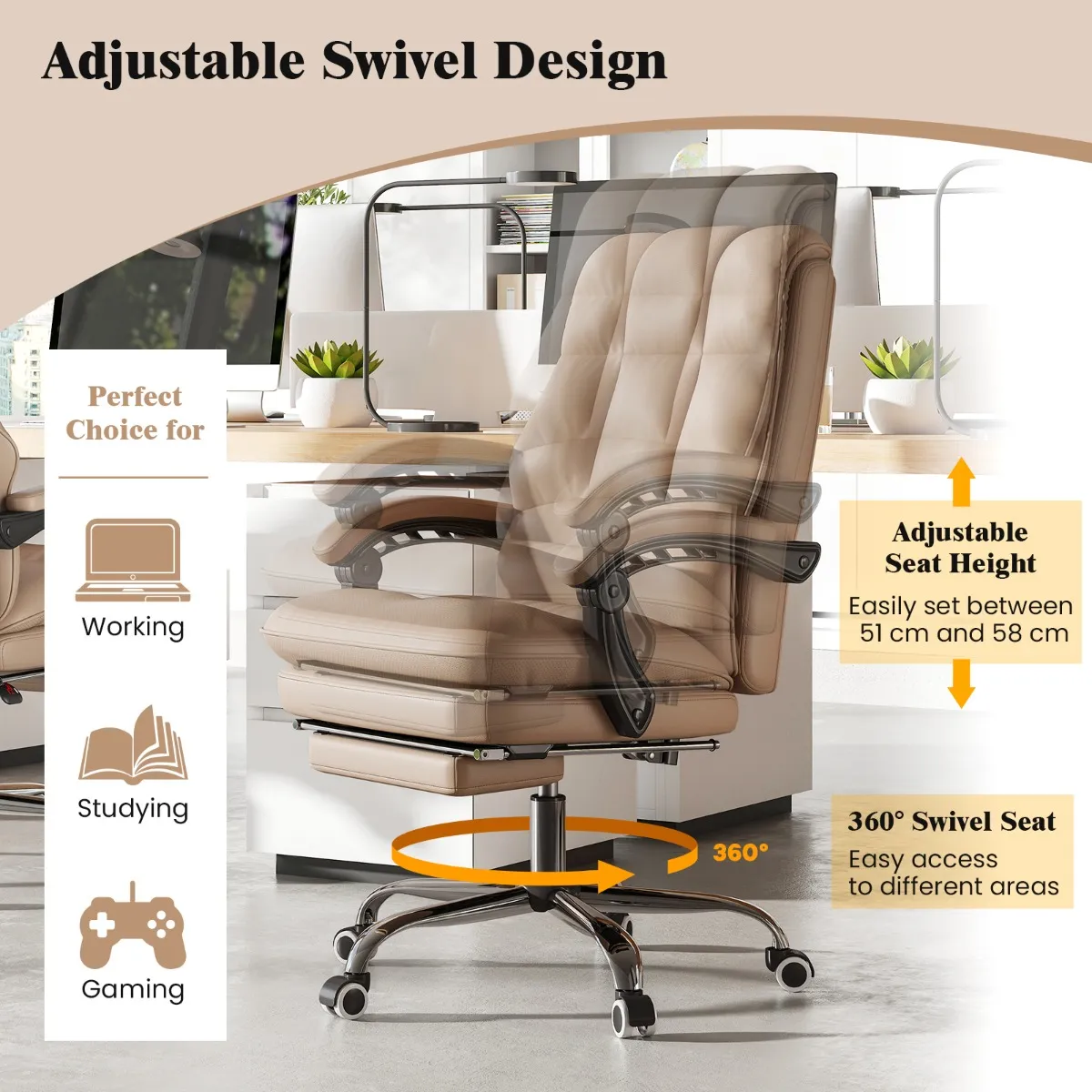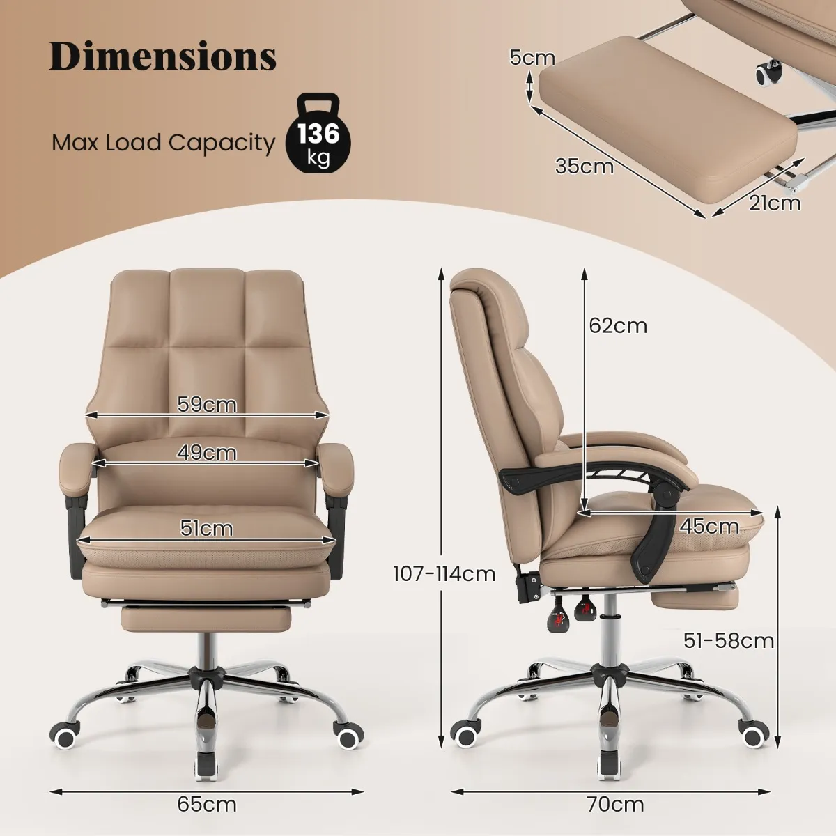 Deze directiestoel is voorzien van PU-leer en elastische sponsvulling, voor comfortabel zitten. De stoel heeft een rugleuning die 155° kan worden gekanteld, zachte armleuningen en een uitschuifbare voetensteun, zodat u een goede houding kunt behouden. Verstel de stoelhoogte eenvoudig en geniet van soepele draaibewegingen dankzij de draaibare zitting. Het beschikt over een stevige metalen basis en gaslift en kan tot 136 kg dragen. Moeiteloos glijden op universele wielen voor eenvoudige verplaatsing op elke werkplek.