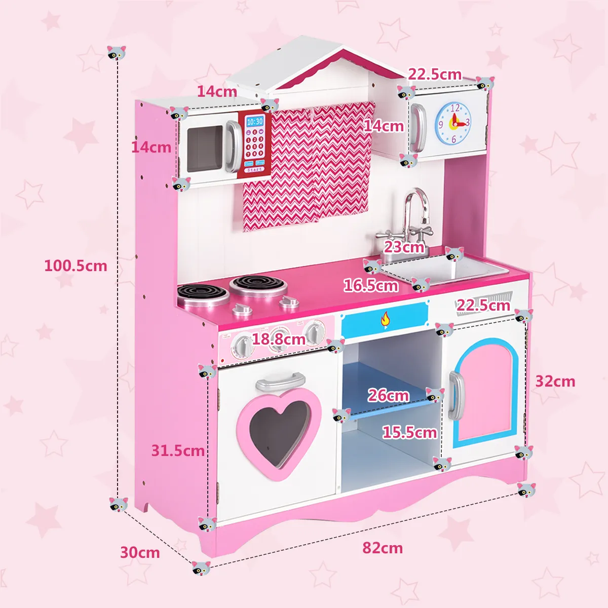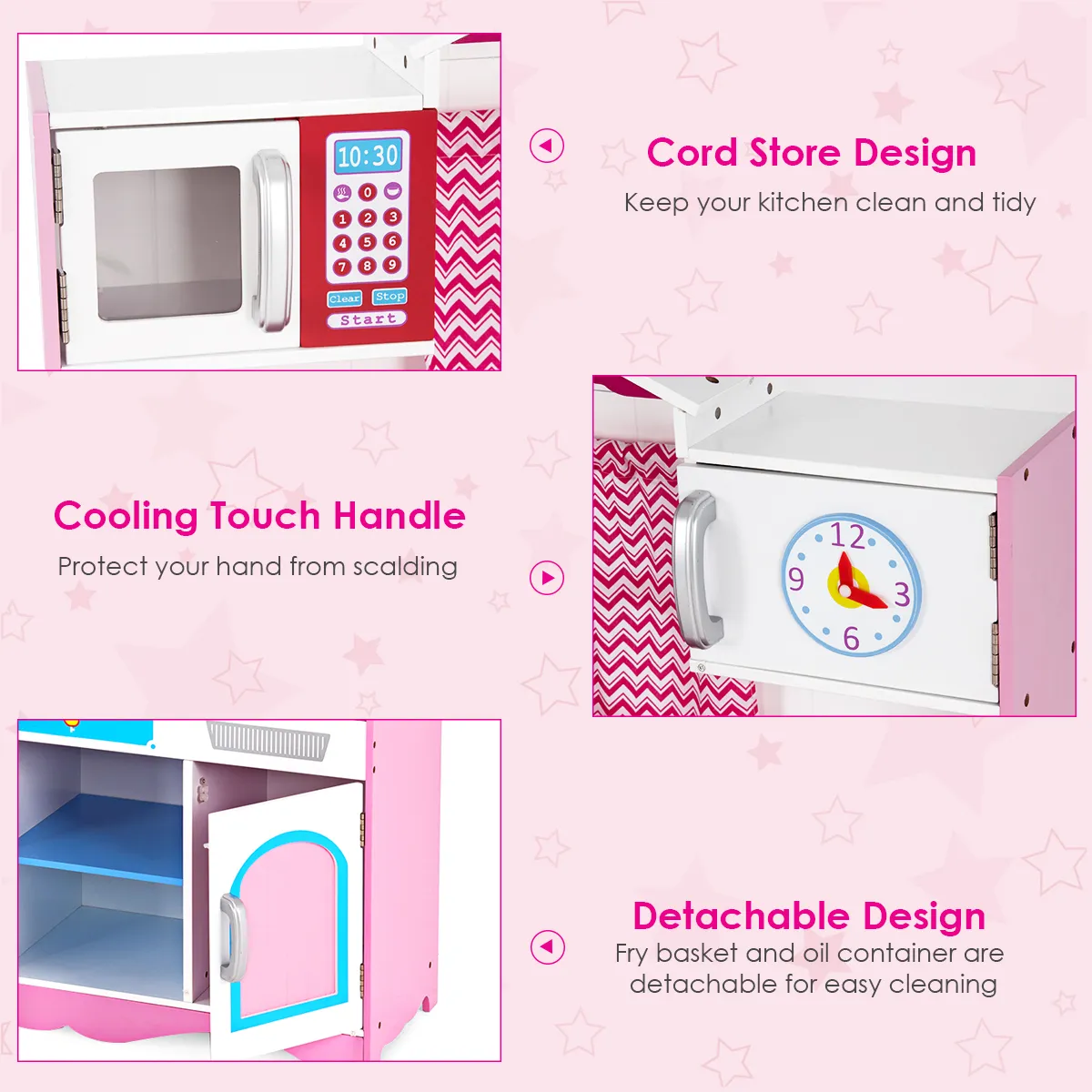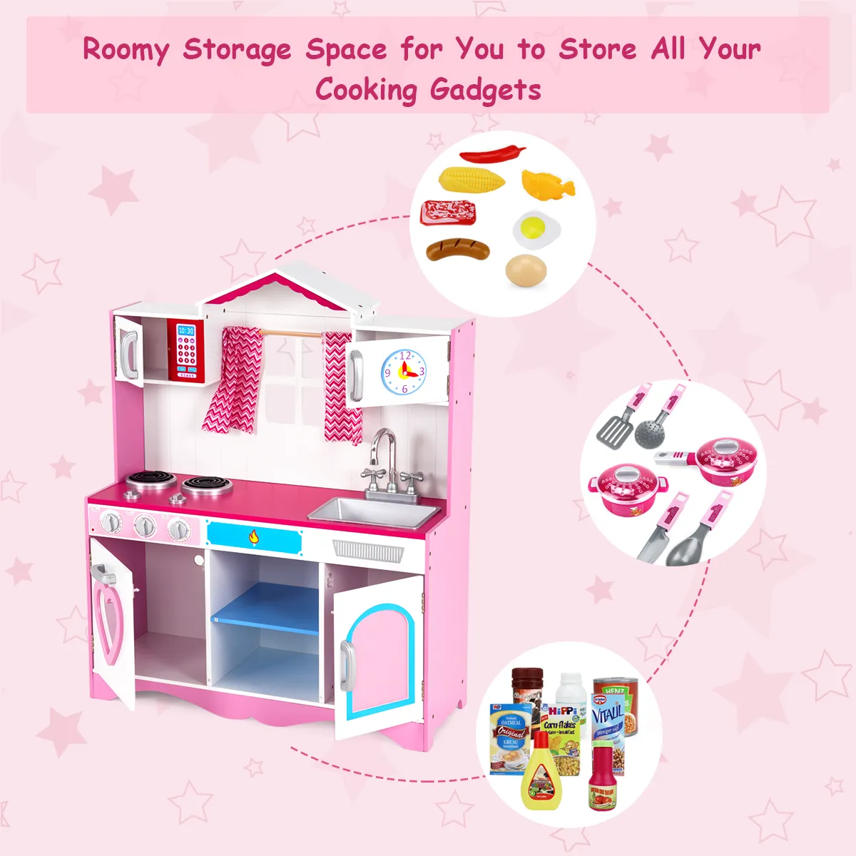 Het simuleert een echte keuken en is ontworpen met een realistische kraan, gootsteen, oven met draaiknop en geluid, magnetron, zodat kinderen kunnen ervaren hoe het is om te wassen, koken en de keuken te verkennen. Bovendien kunnen kinderen al spelend hun oog-handcoördinatie oefenen en hun fijne motoriek ontwikkelen. Bovendien helpt de royale opbergruimte kinderen al op jonge leeftijd goede organisatorische gewoonten te ontwikkelen. De denkbeeldige keukenspeelset is gemaakt van veilige kwaliteitsmaterialen en is stevig en duurzaam. Het is een ideale verrassing voor je kinderen.