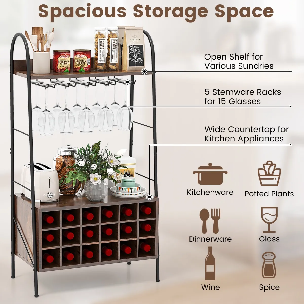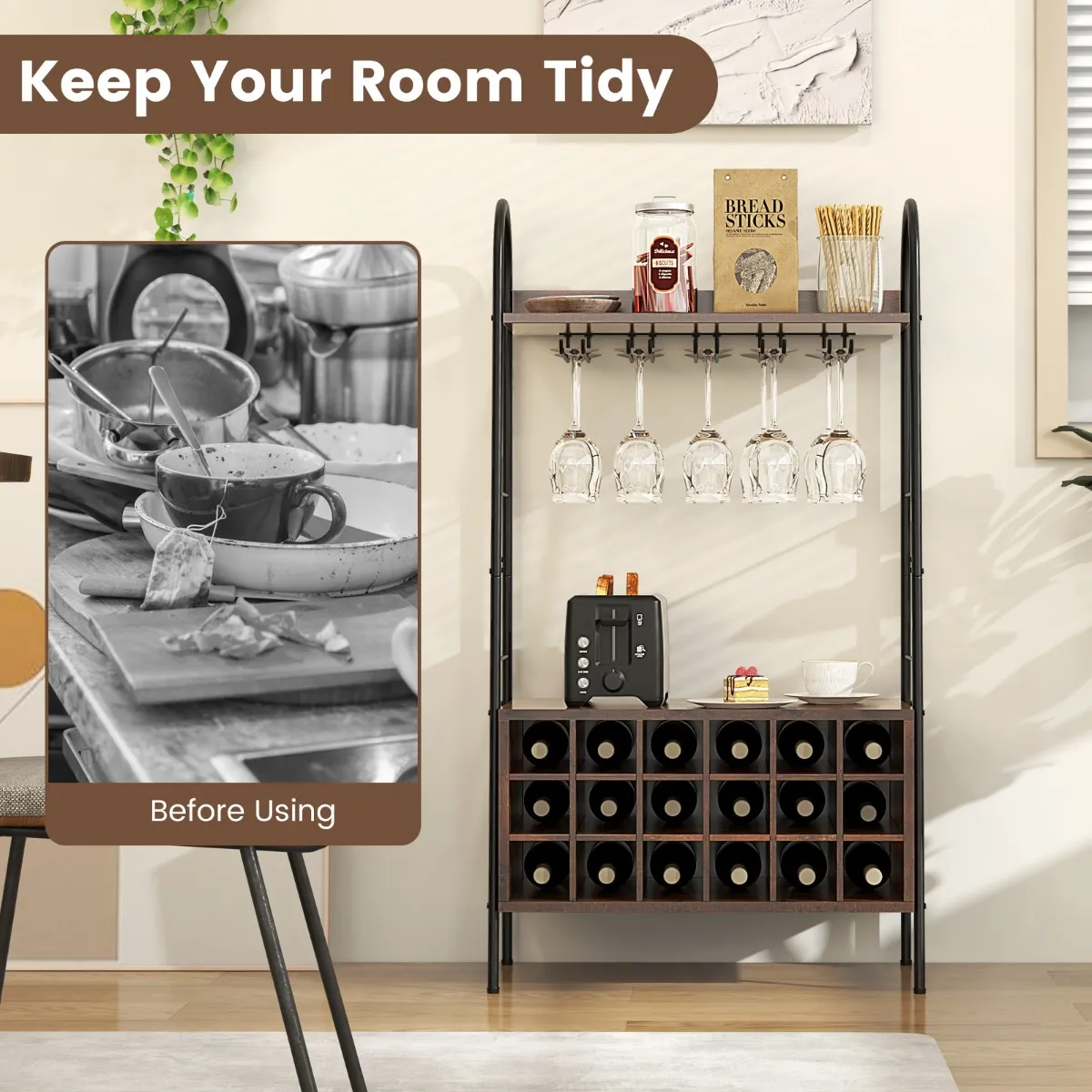 Ons wijnrek is ideaal voor het opbergen van je wijncollectie. Er passen tot 15 glazen in 5 rijen en 18 vakken voor standaard wijnflessen. Bovendien zorgen de brede toonbank en de bovenste plank voor extra opbergruimte. Het stevige metalen frame, anti-kantelontwerp, anti-valrand en verstelbare voetsteunen zorgen voor algehele stabiliteit en veiligheid. Een redelijke hoogte van 114,5 cm biedt gemakkelijke toegang. Je kunt hem gebruiken in de keuken, eetkamer, woonkamer of bar.
