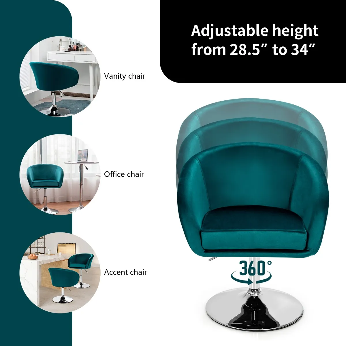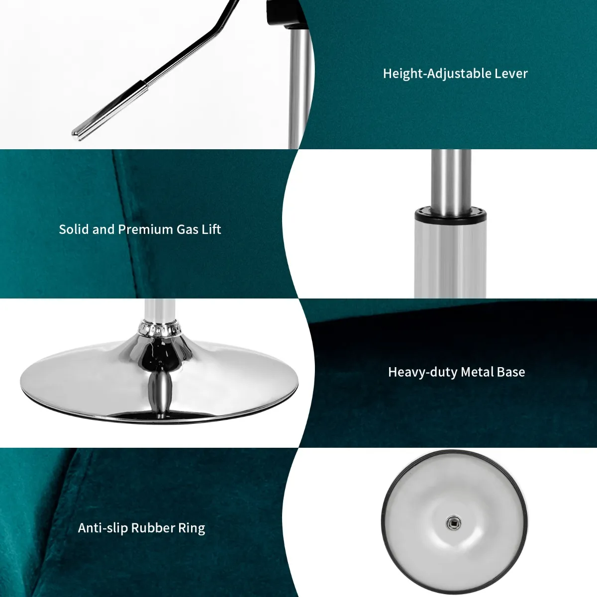 Deze barkruk heeft een verstelbare hoogte van 72 tot 86 cm, geschikt voor de meeste hoge tafels en bureaus. Met een hoogwaardige gaslift kun je de hoogte soepel en geruisloos verstellen door simpelweg de hendel op te tillen. Deze stoel heeft ook een 360 graden draaifunctie voor extra functionaliteit. Deze stabiele barkruk is gemaakt van een metalen frame met een gegalvaniseerd onderstel en zal je lang van dienst zijn. Om een comfortabele zit te garanderen is deze barstoel voorzien van sponzen met een hoge dichtheid voor een langdurige rondheid. En bekleed met zachte fluwelen stof voelt deze stoel aangenaam aan. En de grote zitting, ronde rugleuning en comfortabele armleuningen zijn ontworpen voor ergonomisch zitten. Bovendien heeft hij een voetensteun om krassen op de vloer te voorkomen.