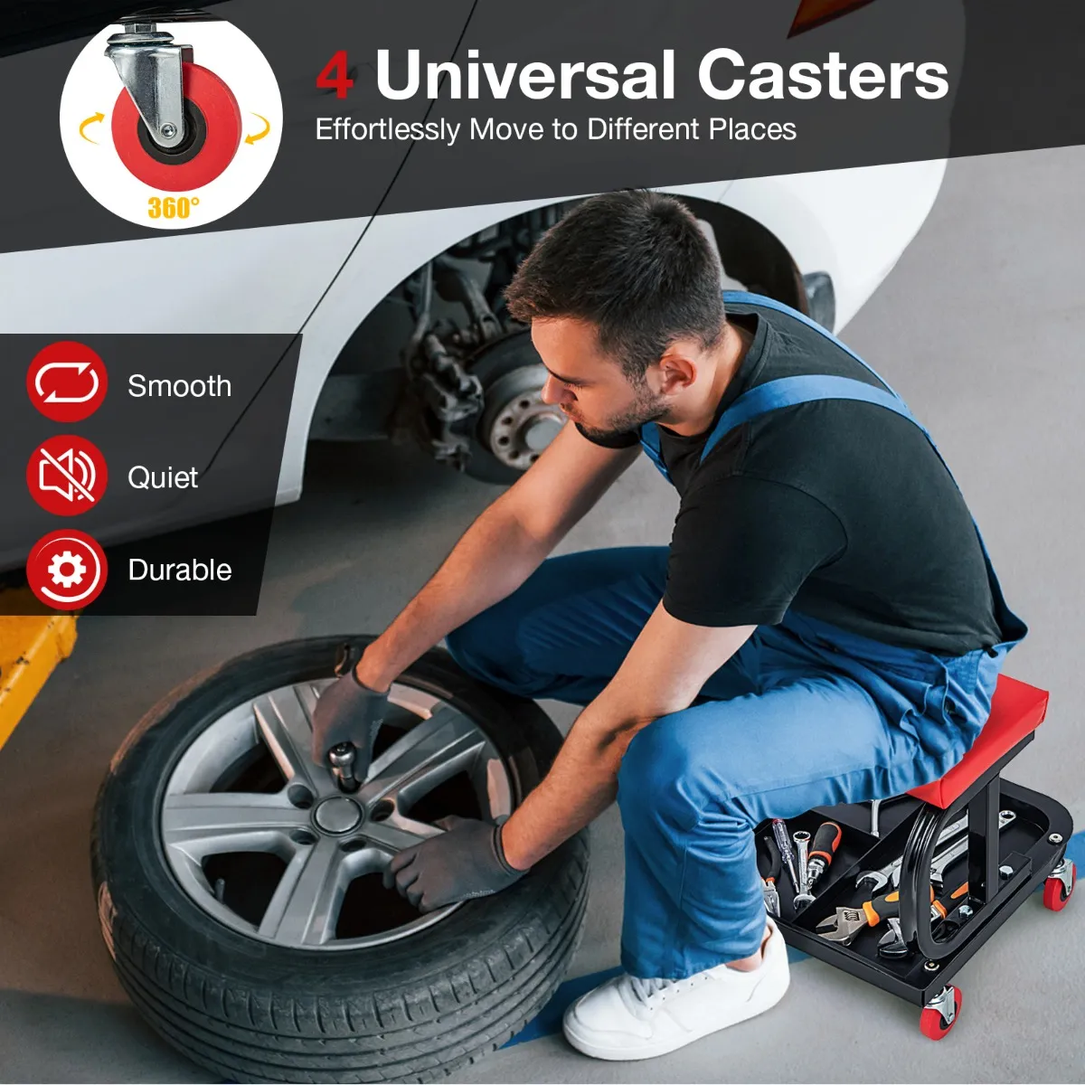 Na een eenvoudige montage is deze garagestoel klaar voor gebruik. De gereedschapsbak met 3 vakken is perfect voor het opbergen van gereedschap van verschillende afmetingen. Dan kan het zacht gevoerde zitkussen niet wachten om je te vertellen hoe comfortabel het is. En of je nu de voor- of achterbanden wilt repareren, je doet het met gemak dankzij de 4 universele wielen. En maak je geen zorgen over de stabiliteit. Het stevige metalen frame geeft deze rolkruk een maximale belasting van 150 kg.