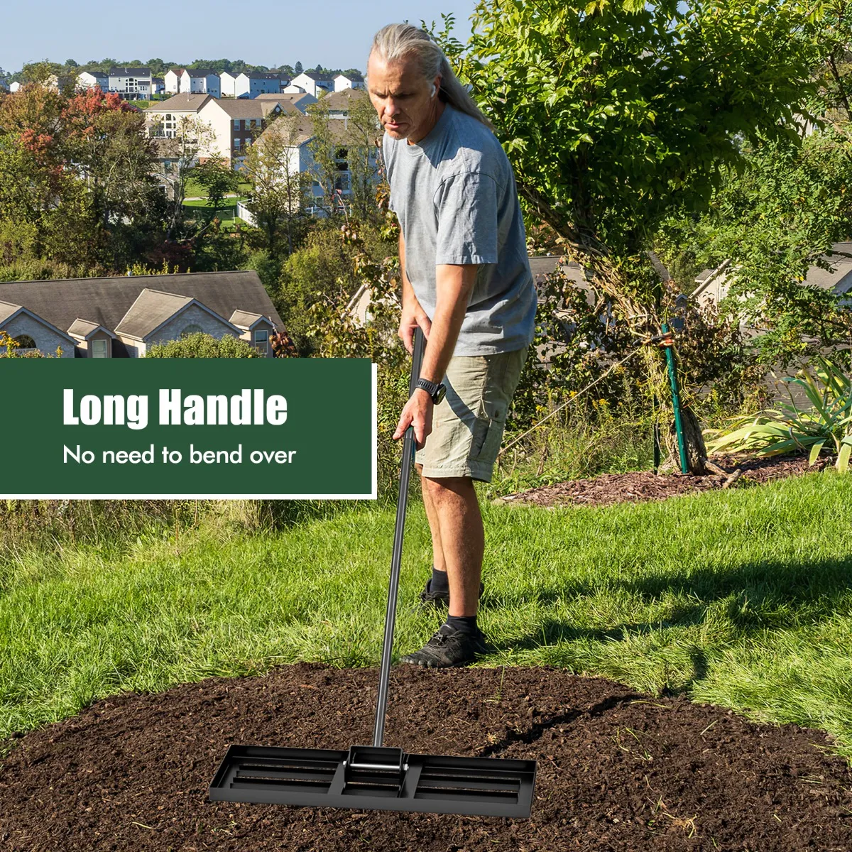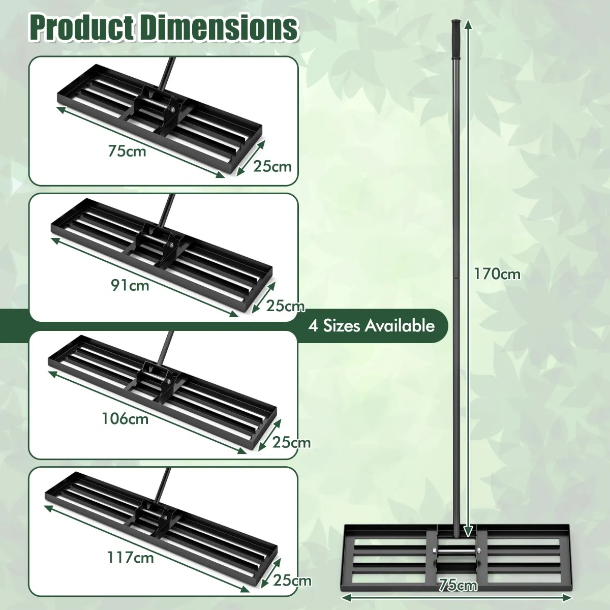 De egaliseerhark wordt geleverd met een plaat van 75 x 25 cm, zodat je je gazon mooi vlak kunt houden. De 2 afneembare handgrepen zijn lang genoeg zodat je kunt werken zonder te bukken. Je kunt ze gemakkelijk demonteren om ze op te bergen als je ze niet gebruikt. De rubberen handgreep zorgt voor een stevige, comfortabele grip. Het 1,8 mm verdikte metaal is extreem duurzaam en robuust, en de poedercoating op het oppervlak is roestbestendig. Deze hark is eenvoudig te monteren en is een uitstekende keuze voor het egaliseren van het gazon in je tuin of op je golfbaan.