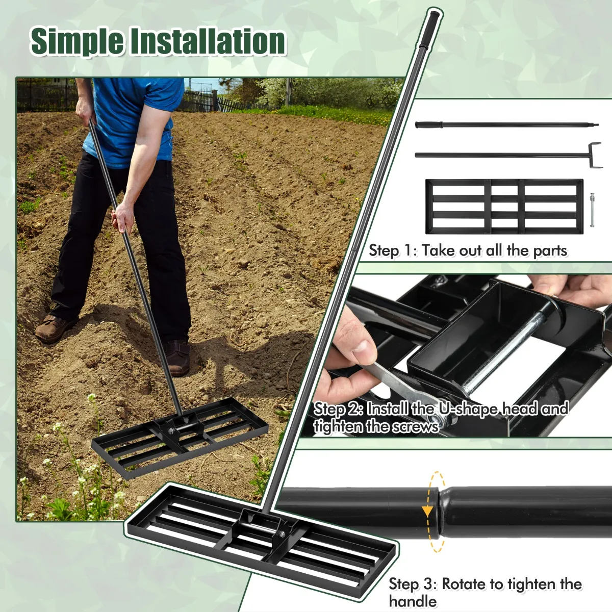 【Efficiënte, brede vlakke hark】: Onze egaliseerhark voor gazons heeft een strooiplaat van 75 x 25 cm, die een groot oppervlak bestrijkt om gemakkelijk stenen uit de grond te verwijderen en kleine kluiten op te breken. Bovendien wordt hij geleverd met een U-vormige kop met flexibele rotatie om je egaliseerwerk te versnellen.