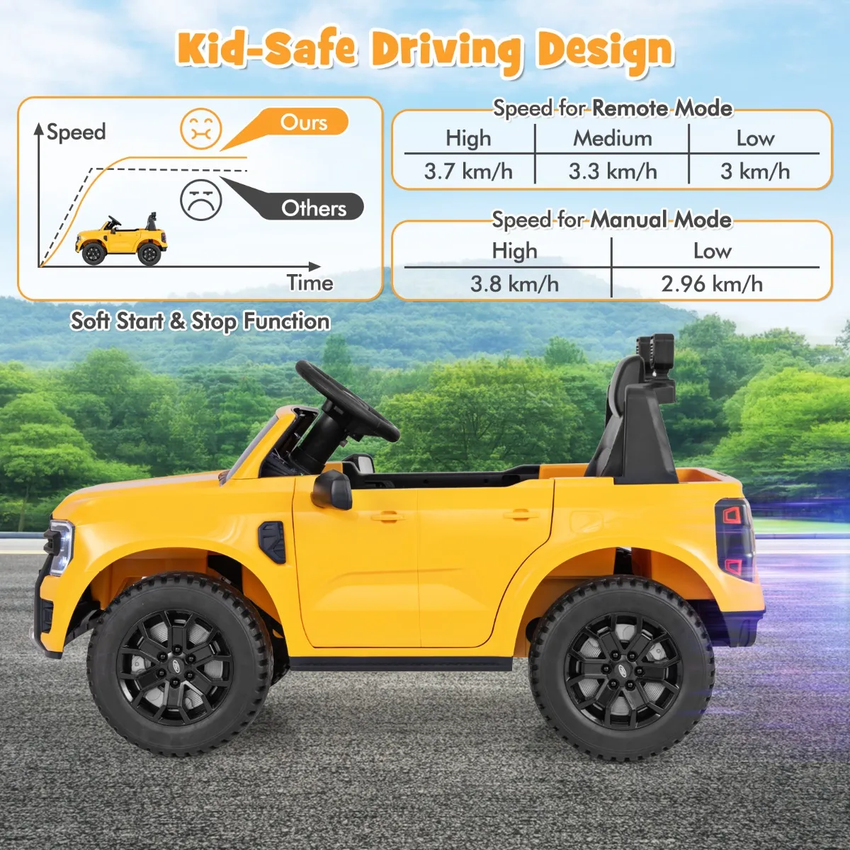 【Geavanceerde veiligheidsfuncties】: Zet veiligheid op de eerste plaats met dit speelgoed, met een zacht start- en stopsysteem om plotselinge bewegingen te voorkomen. De Ford Ranger auto met rijbewijs biedt de flexibiliteit van 3-traps snelheid op afstand en 2-traps handmatige snelheid, zodat je het perfecte tempo kunt instellen.
