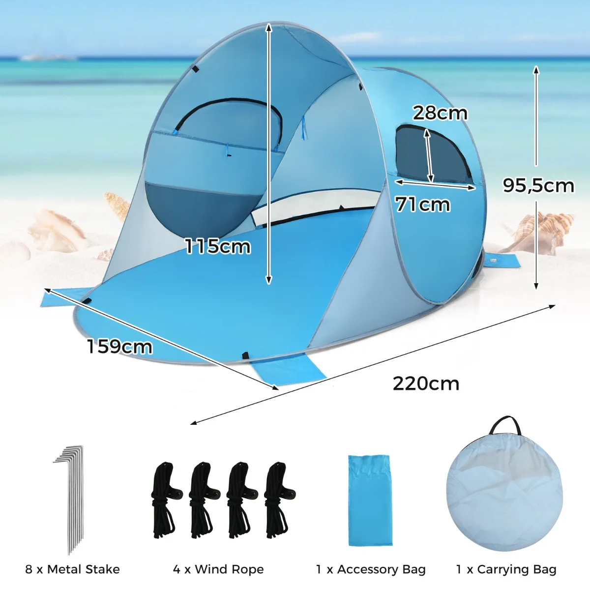 - Leveringsomvang: 1 x Pop-up strandtent4 x Winddichte touwen8 x Metalen spiesjes1 x Draagtas1 x Gebruikershandleiding