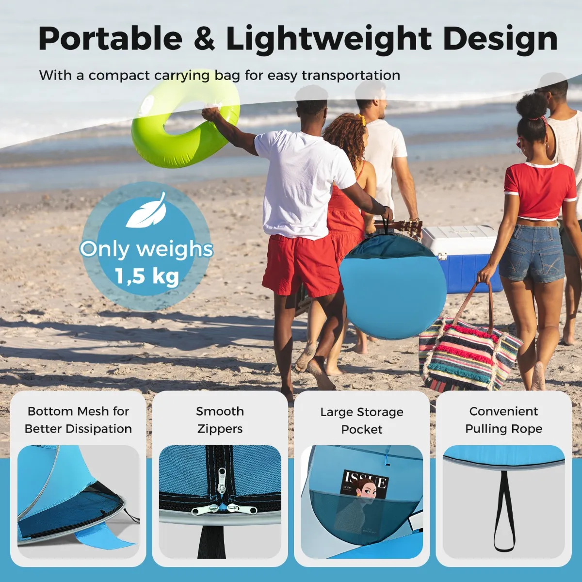 【Pop-Up ontwerp & Draagbaarheid】De automatische pop-up strandtent kan in enkele seconden worden opgezet en ingeklapt, zonder extra montage. Uitgerust met een draagtas, kan de opvouwbare tent netjes worden ingepakt voor gemakkelijk transport en opslag. Het lichte en compacte formaat is bovendien gemakkelijk mee te nemen op reis.