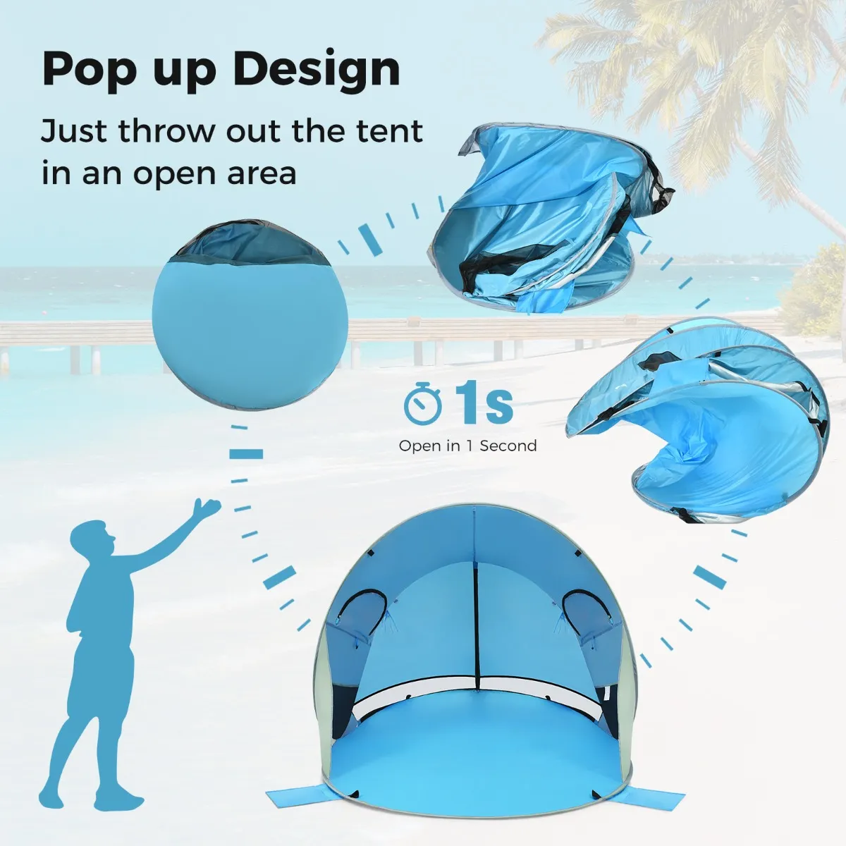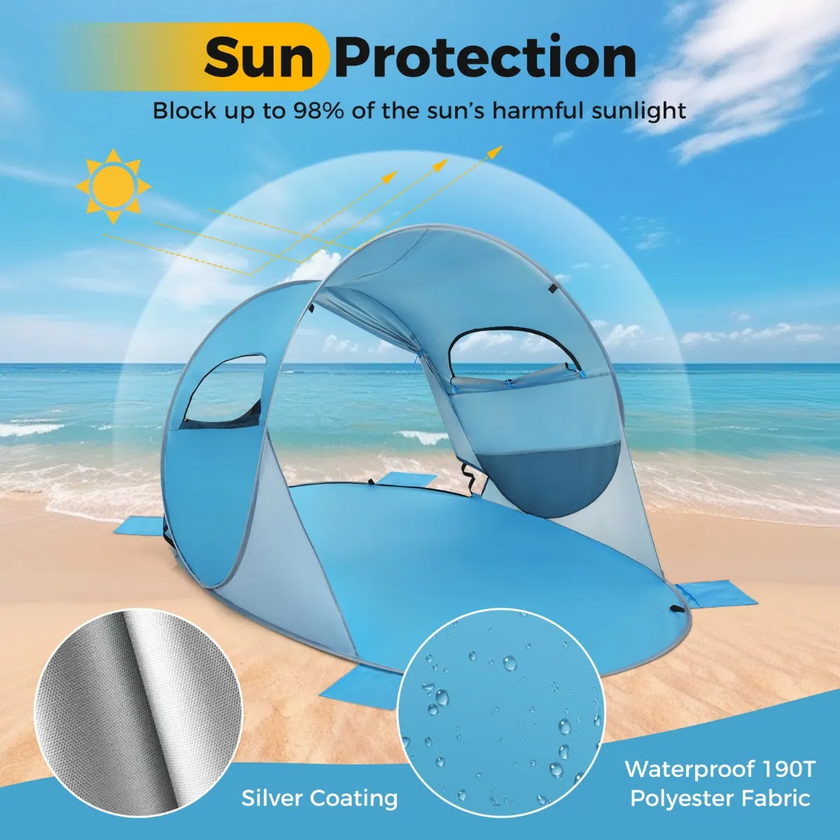 Deze draagbare tent is voorzien van pop-up ontwerp, waardoor u tijd en energie bespaart. De draagbare strandtent met 2 gaas ventilatie ramen en 2 ruime ingangen, biedt een onbelemmerde toegang tot het natuurlijke landschap en 360-graden luchtventilatie. Een achterdeur met ritssluiting kan naar behoefte worden geopend of niet. Deze beschutting is bekleed met zilver gecoat doek en beschermt u tegen schadelijke zonnestralen en regendruppels. Bovendien kunt u zand in de zakken doen om de stabiliteit en stevigheid te verbeteren. Deze grote cabana biedt plaats aan 3-4 personen, omdat het koepel ontwerp, waardoor het geschikt is voor familie om te kamperen en picknicken.