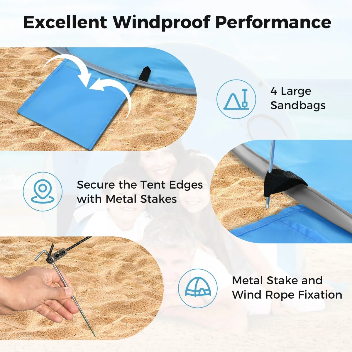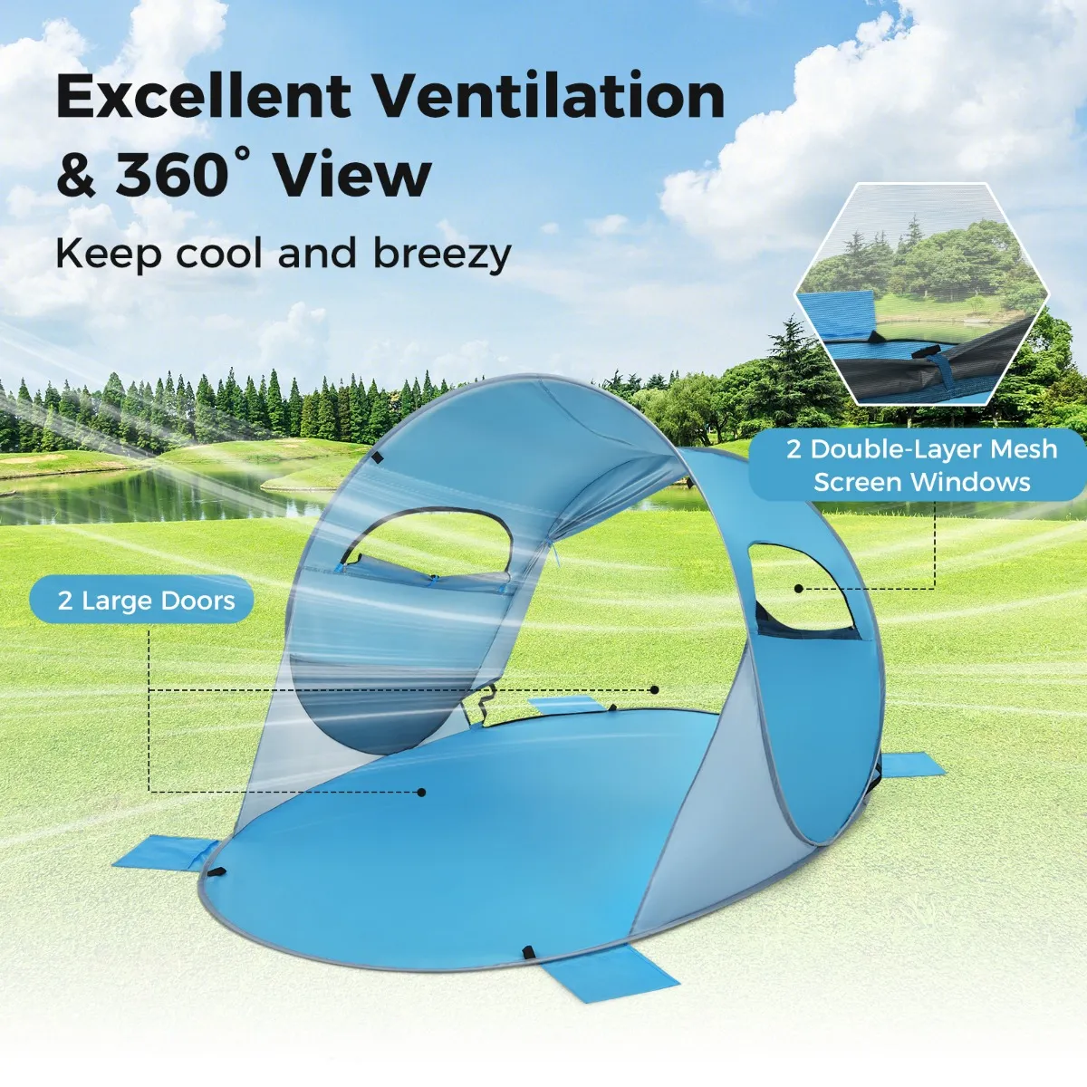 【360° ventilatie & Windafstotend】2 grote gaasramen en 2 ruime ingangen bieden u een uitstekend uitzicht en frisse luchtventilatie. Met een deur met rits van één zij-ingang, kunt u deze naar behoefte openen of niet. De 8 haringen, 4 scheerlijnen en 4 zandzakken verbeteren de stabiliteit in de wind.