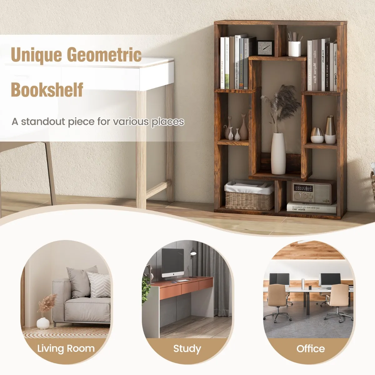 Unieke geometrische boekenkast: Deze boekenkast heeft een uniek geometrisch ontwerp, waardoor een samenhangende en visueel aantrekkelijke ruimte ontstaat. Of hij nu in de woonkamer of op kantoor wordt gebruikt, de boekenkast wordt een opvallend stuk dat de algehele uitstraling van je woonruimte verbetert.