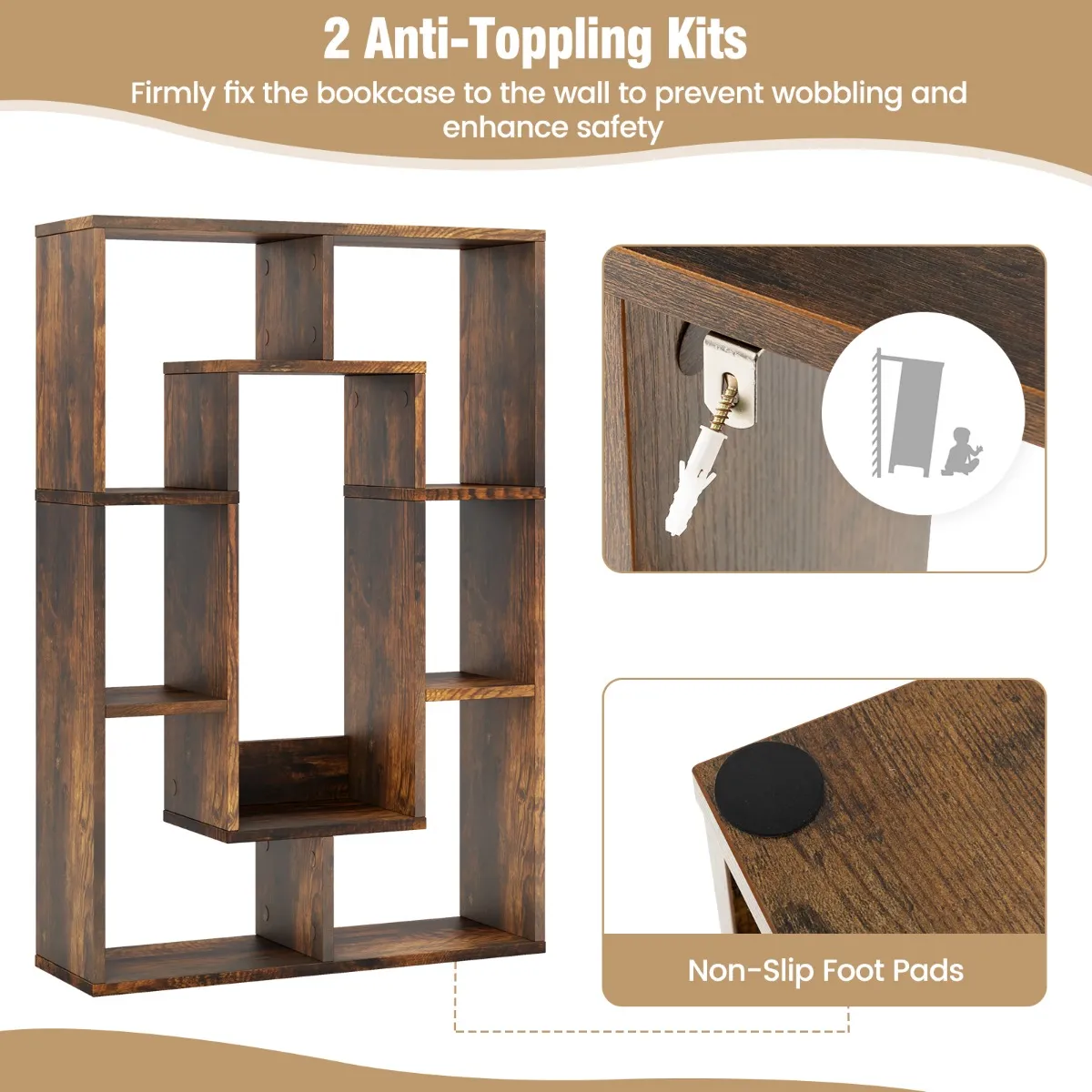 Anti-kantelontwerp: Dankzij de 2 anti-kantelsets kun je de boekenkast aan de muur bevestigen om omkantelen te voorkomen, wat een veilige omgeving biedt voor je gezin. En de randbescherming voorkomt dat voorwerpen eruit vallen.