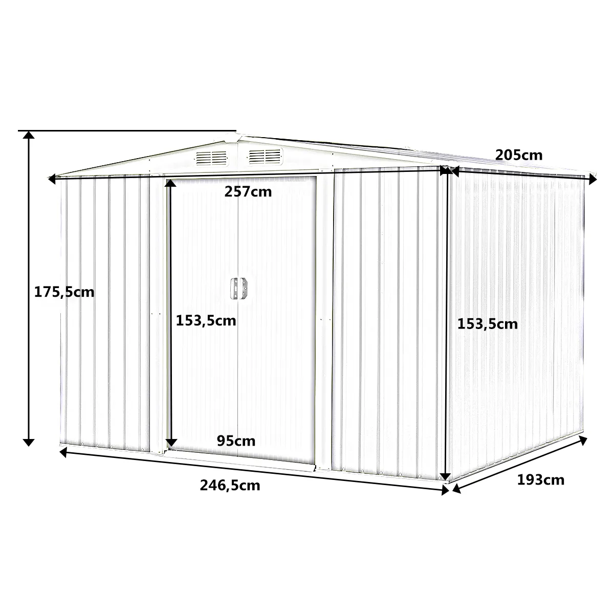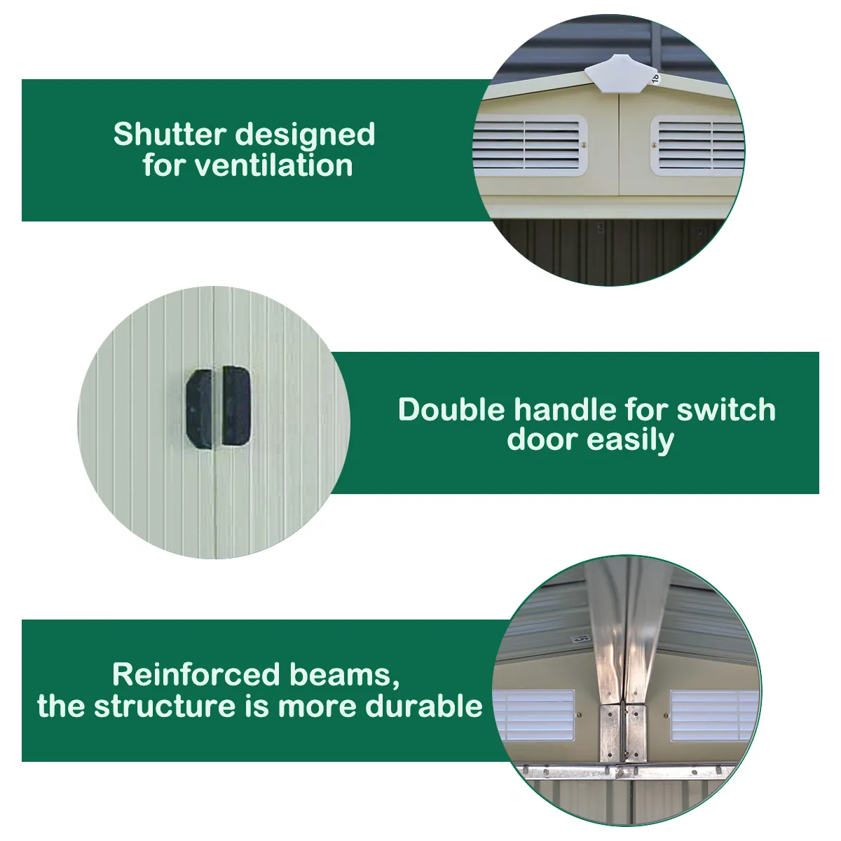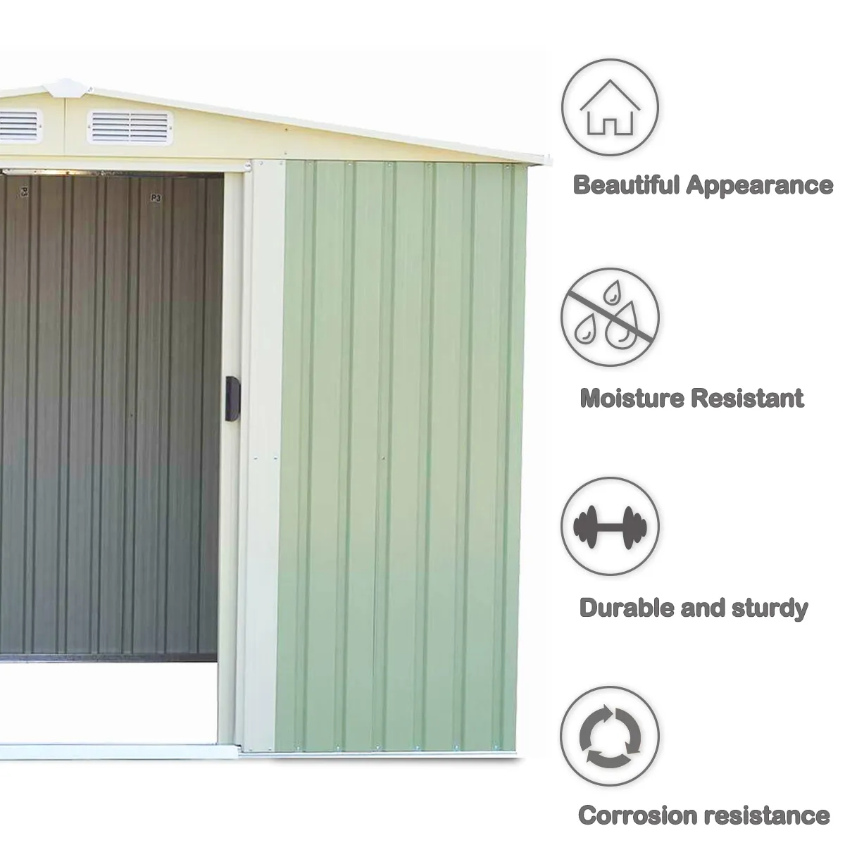 Geef uw gereedschap een beste plek om op te slaan met deze tuinberging. En deze betaalbare compacte openlucht opslagschuur kan overal in de binnenplaats of het dek worden geplaatst waar de opslag nodig is. Deze tuin opslag huis kan bieden genoeg opslagruimte voor uw gazon en tuin ambachten, fietsen, zwembad benodigdheden en andere items. Het gegalvaniseerd staal en de kleurplaat zorgen voor een duurzaam en stevig tuinhuisje. Bovendien is dit gereedschapshuisje anticorrosief en waterdicht. Plus, met zadeldak, is deze schuur niet gemakkelijk voor water en sneeuw die zich ophopen, die zijn levensduur waarborgen. Of het nu winderig of regenachtig is, dit huis zal u de beste bescherming voor uw gereedschap geven. De twee ventilatieopeningen worden ontworpen voor verfrissing van de lucht. En de twee schuifdeuren zijn gemakkelijk te gebruiken. . Kom en koop er een! Het is een ideale optie voor u!