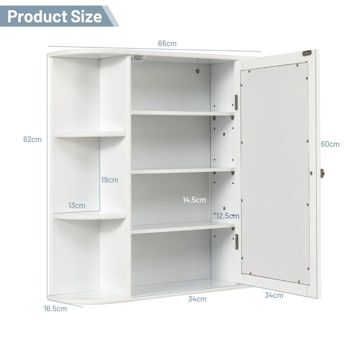 Bent u nog steeds op zoek naar een gunstige opbergkast om een opgeruimde en schone kamer te bezitten? Onze badkamerkast zou één van de aangewezen keus voor u zijn. Gemaakt van stevige densiteitsplaat, is dit opslagkast duurzaam en stevig om de test van tijd te weerstaan. Het is ontworpen met 1 gesloten spiegeldeur en 6 open compartimenten, die flexibel is voor u om spullen op te slaan in verschillende secties. Dit badkamermeubel voor wandmontage maximaliseert de beschikbare ruimte in uw badkamer en verbetert de opslagefficiëntie perfect. Geschikt voor verschillende woonstijlen, kan het worden gebruikt in de woonkamer, slaapkamer, keuken, enz.