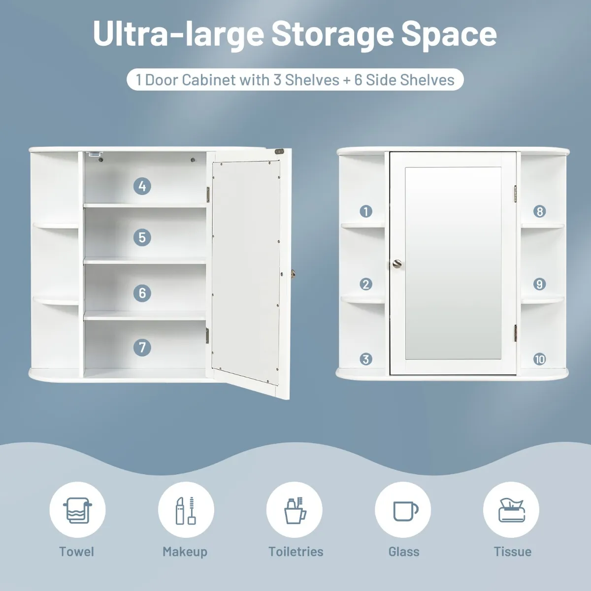 【Voldoende opbergruimte en verstelbare planken】Deze opbergkast heeft zes open planken om de meest gebruikte spullen op te plaatsen, zoals handdoeken, toiletartikelen, tissues en meer. De binnenste plank met een spiegeldeur heeft 3 hoogte-instellingen om verschillende maten items te plaatsen. Bovendien is de spiegeldeur ontworpen voor een duidelijke reflectie vanuit elke hoek.