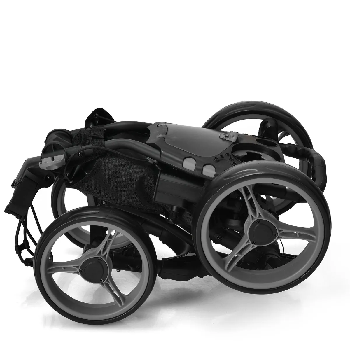 Functionele golfkar: Grote onderhoudsvrije EVA-wielen van φ 27 cm achter en φ 24 cm vooraan zorgen voor een perfecte balans en tractie op alle soorten terrein. Hij staat op 4 duurzame PP-wielen bedekt met slijtvast EVA-schuim, zodat hij zelfs op oneffen oppervlakken soepel loopt.