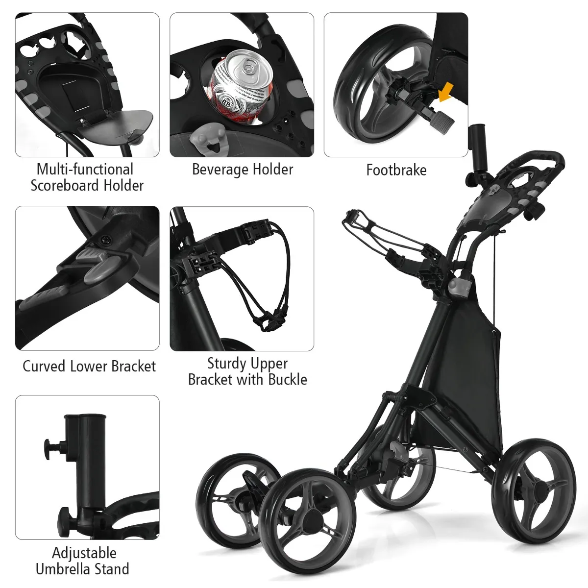 Hij heeft vier duurzame EVA-schuimwielen met hoge dichtheid en kogellagers die zorgen voor een soepele rit en perfecte tractie op alle soorten terrein. De achterwielen zijn voorzien van een pedaalrem voor een stabiele grip op de weg wanneer gebruikers een pauze willen nemen of de perfecte tee-spot willen vinden. Met goede draagbaarheid en geschikte hoogte is het een ideale golfkar voor mannen en vrouwen.