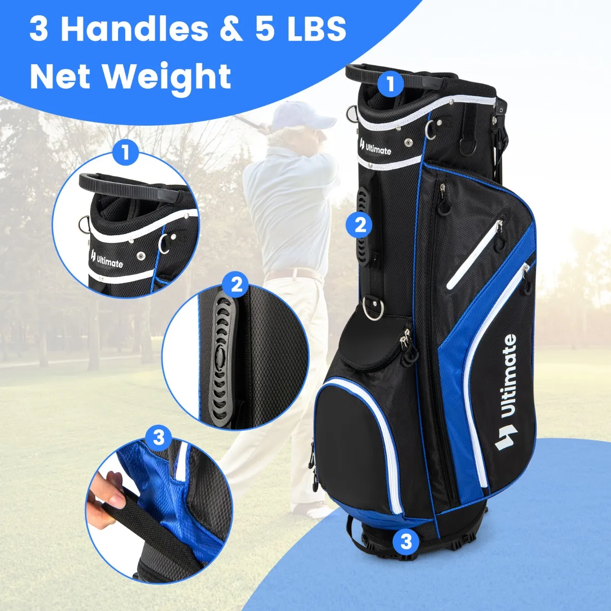 Met een 14-voudige top-organizer kunnen alle golfclubs die je nodig hebt in deze golftas goed worden georganiseerd, geen verwarring of krassen meer. Er zijn voldoende zakken om golfuitrusting zoals koude dranken, kleding, hoeden, afstandsmeters, golfballen en meer op te bergen. Bovendien is de gevoerde tas met waterdichte ritssluiting bedoeld voor het opbergen van waardevolle voorwerpen zoals mobiele telefoon en horloge. De paraplu, de golfdoek en de handschoen kunnen ook buiten de golftas worden bewaard. Deze lichte golftas is moeiteloos met 3 handgrepen en een dubbel riemsysteem te dragen. De regenhoes is inbegrepen om de rackets tegen regen of uitvallen tijdens het transport te beschermen.