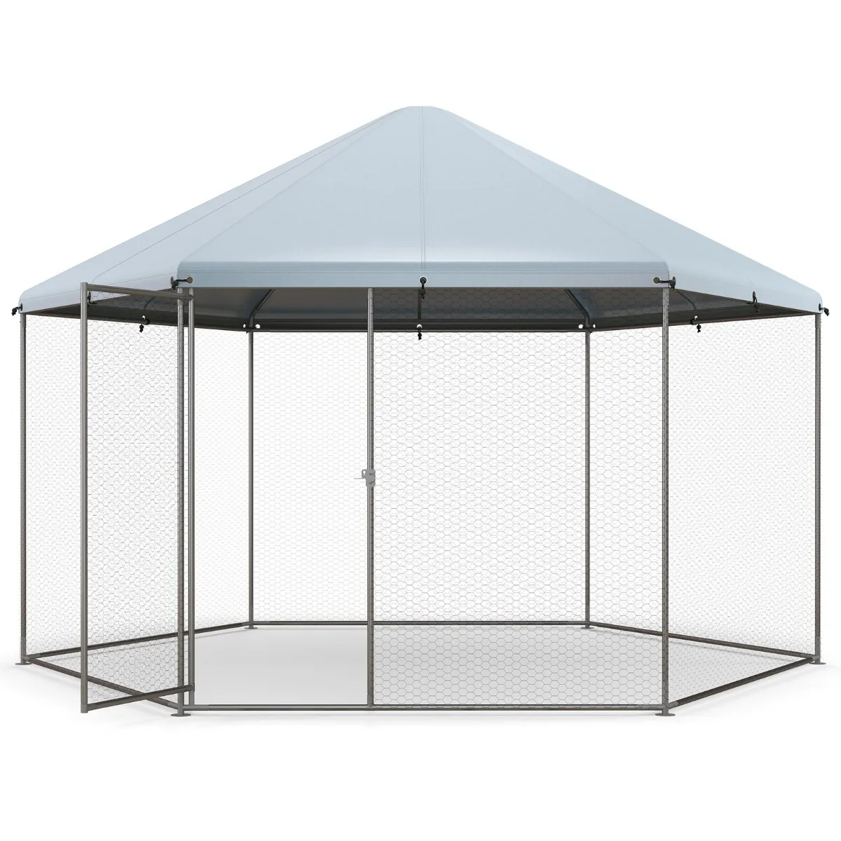 Wil je een duurzame schuilplaats voor je gevederde vrienden? Kies onze zeshoekige metalen kippenhok. Met een weerbestendige afdekking van Oxford-weefsel creëert ons inloopkippenhok een gezellige en droge plek om je gevogelte terug te trekken. Ongeacht de weersomstandigheden zorgt ons kippenhok ervoor dat je kippen kunnen gedijen zonder te wanken. Het unieke ontwerp van het puntige dakvormige bovendeel vergemakkelijkt efficiënt waterafvoer en voorkomt elke ophoping.