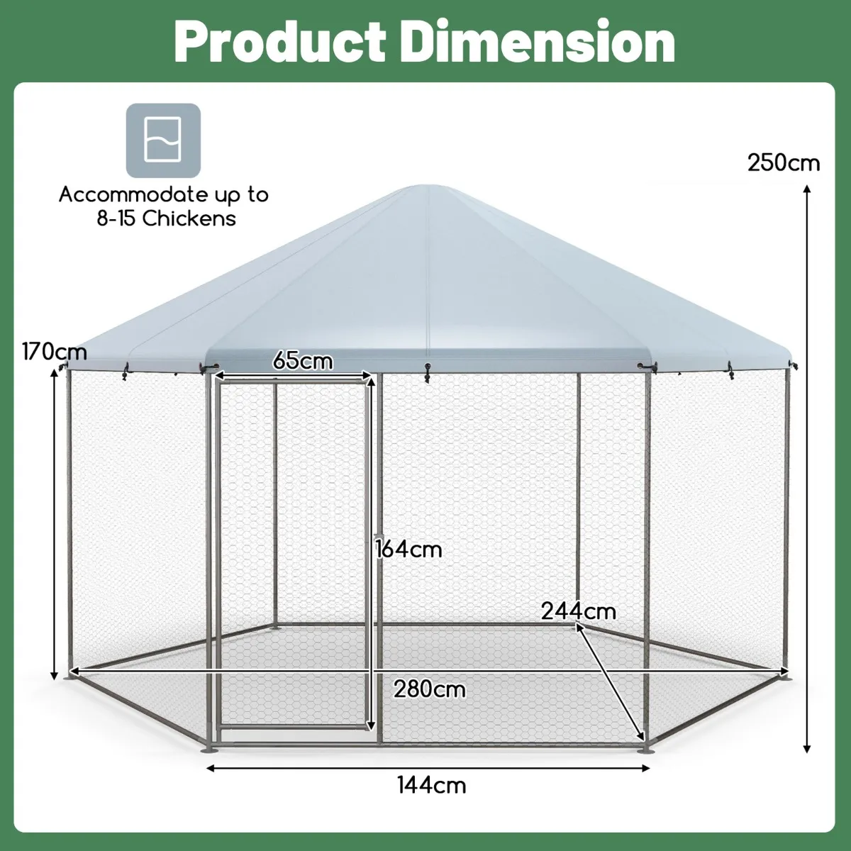 Ruim en veelzijdig gebruik: Met een royale oppervlakte van 280 cm x 244 cm x 250 cm (l x b x h) biedt de zeshoekige boerderij-kippenhok comfortabel ruimte voor maximaal 8-15 kippen. Het metalen kippenhok dient ook als ideale leefruimte voor pauwen, ganzen, konijnen, eenden en verschillende andere soorten gevogelte.