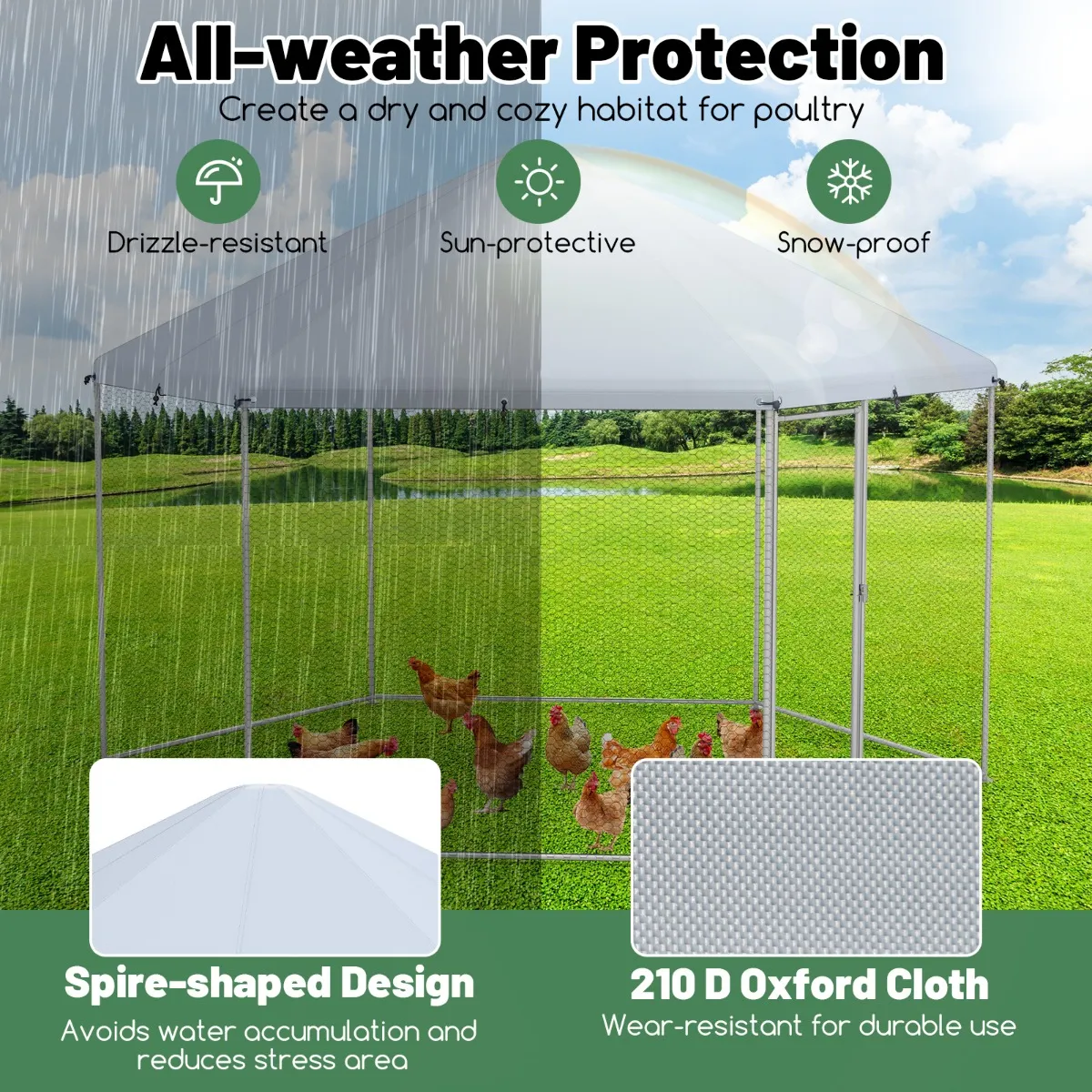 Weerbescherming: Het inloophok beschikt over een afdekking van Oxford-weefsel, die niet alleen duurzaam, maar ook regenbestendig, zon- en sneeuwbestendig is, om het hele jaar door comfort voor je gevogelte te te garanderen. Het puntige dakvormige bovendeel vergemakkelijkt efficiënte waterafvoer en houdt de binnenkant droog en comfortabel.