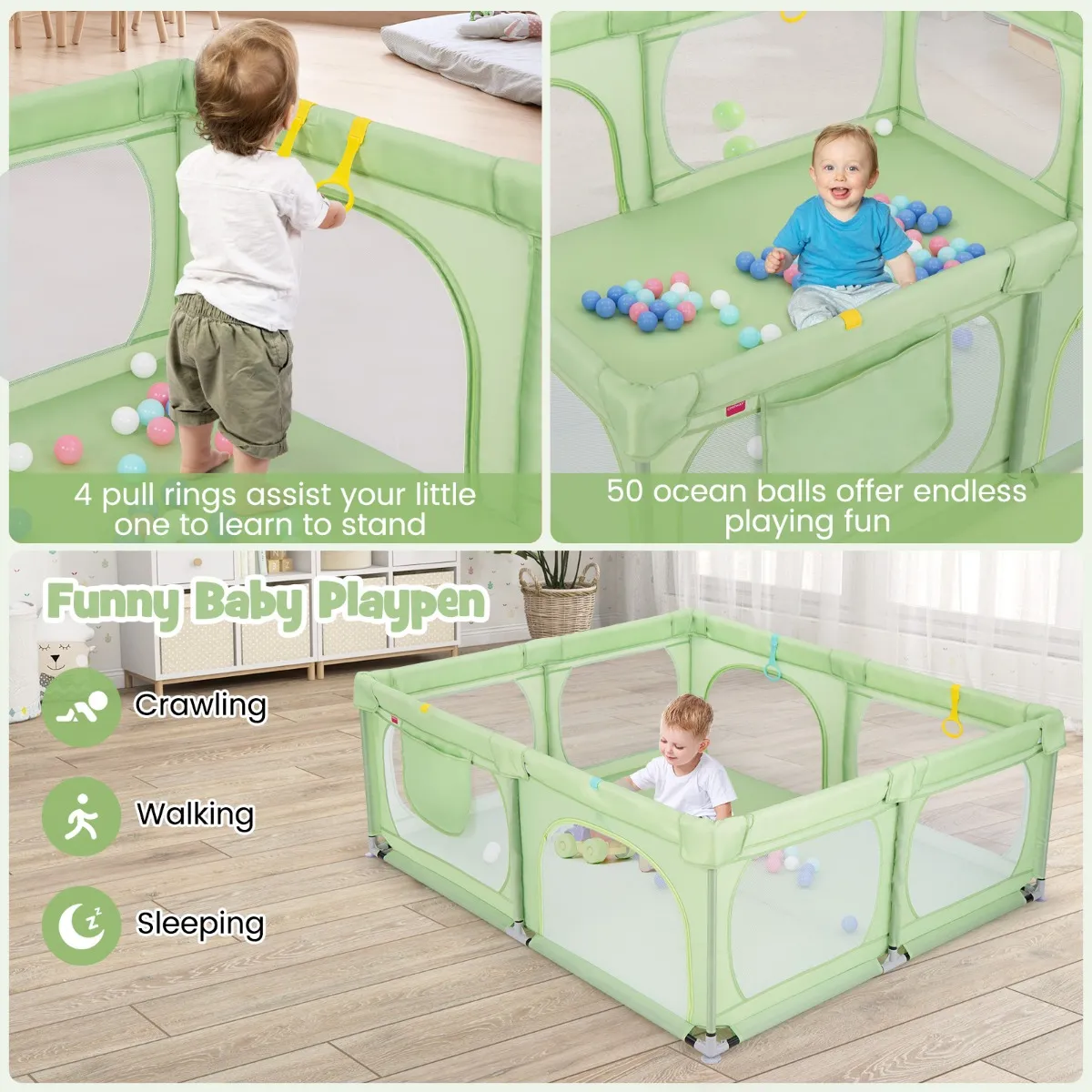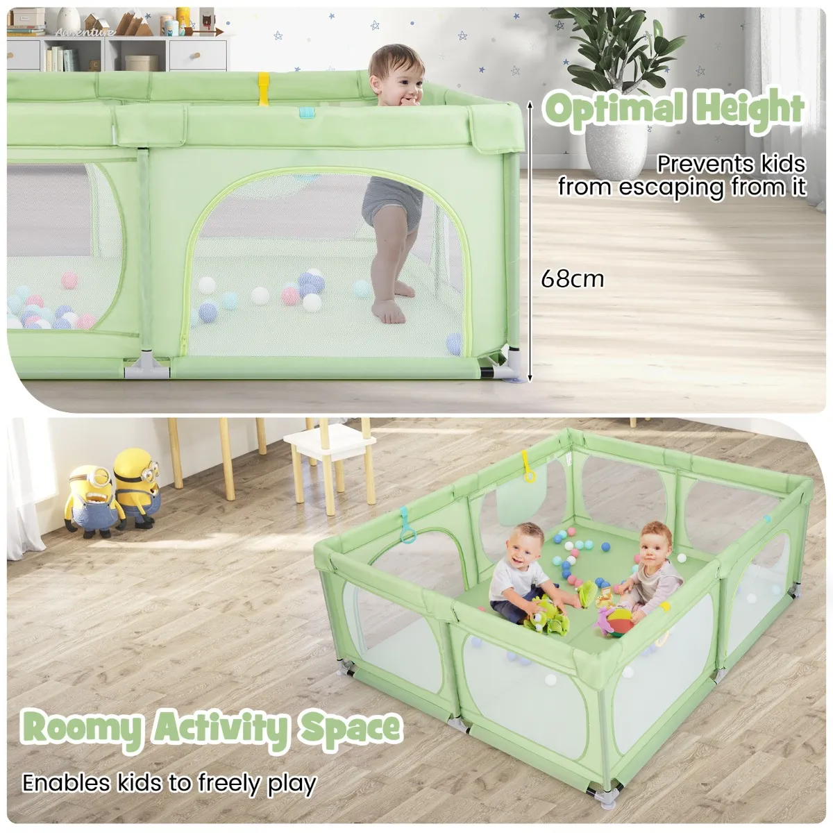 Houd je kleintje bezig en veilig met onze grote box !!! Dit grote activiteitencentrum meet 190 x 158 x 68 cm (L x B x H) en is geschikt voor 3 tot 5 kinderen. Het zal een leuke plek zijn voor je kleintjes om vrij te spelen en te ontdekken. Bovendien heeft het 4 trekringen om te oefenen met staan en 50 oceaanballen om mee te spelen. Er is een opbergvak voor verschillende dingen. Hij is ook voorzien van deurtjes met rits, hoekbeschermers en transparante gaaswanden voor uitzonderlijke veiligheid. Na gebruik is hij gemakkelijk mee te nemen en op te bergen dankzij de draagbare tas.