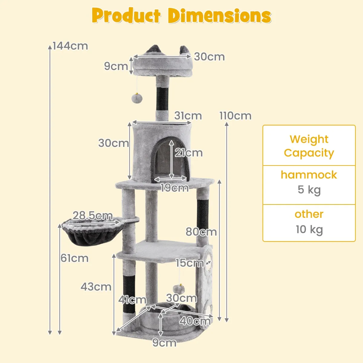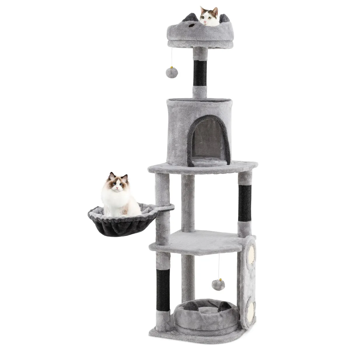 Deze kattenboom met meerdere verdiepingen is voorzien van een zitstok, een gevoerde hangmat, een kussen en een ruim hok, en is geschikt voor huishoudens met meerdere katten. Hij is voorzien van diverse sisal krabpalen en twee sisal krabplanken die inspelen op de natuurlijke krabdrang. Hij wordt geleverd met twee hangende kwastjes met belletjes die uw katten zullen boeien en hen zullen vermaken en mentaal stimuleren. Dankzij de kantelbeveiliging en de stabiele basis kunnen uw katten zonder risico’s ontdekken en spelen.