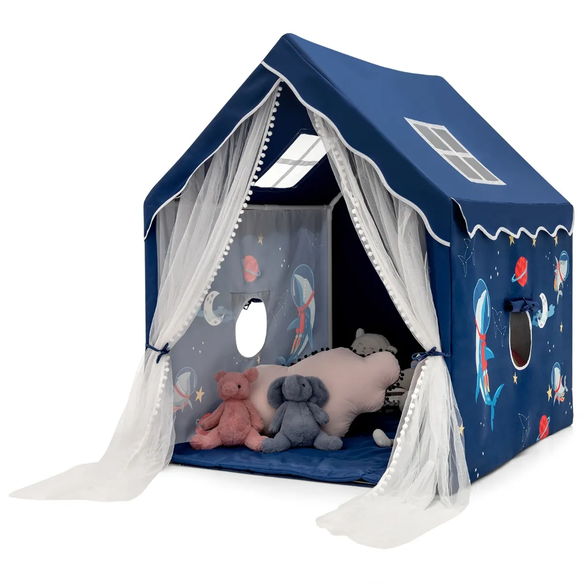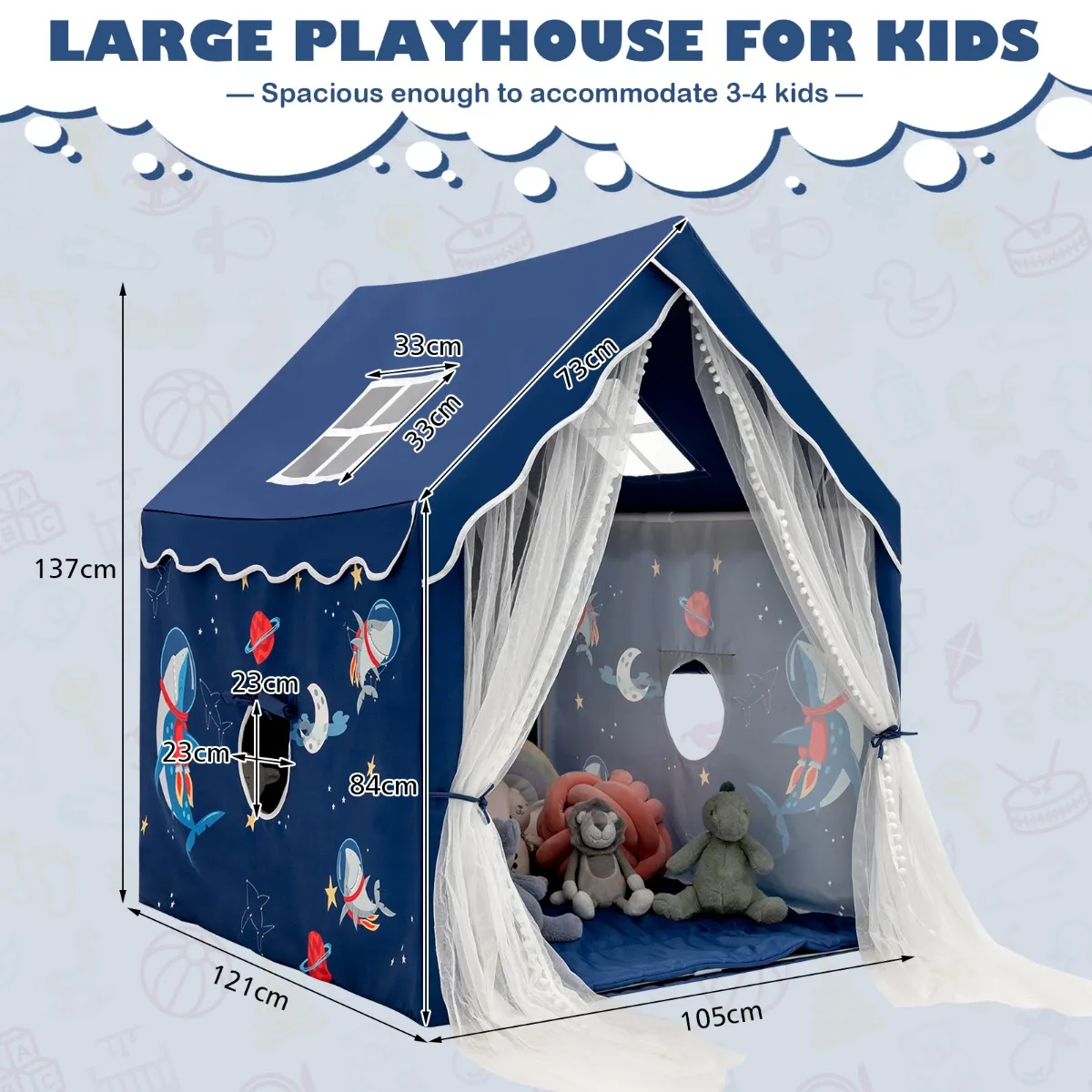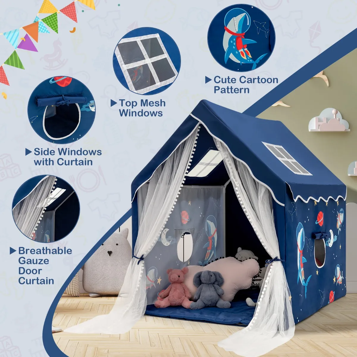 Het meet 121 x 105 x 137 cm, wat groot genoeg is voor 2-3 kinderen om te verkennen of te ontspannen. We ontwerpen het ook met schattige cartoonpatronen en 2 kleuropties om verschillende kinderen aan te spreken. 2 mesh-ramen bovenaan, 2 mesh-ramen aan de zijkant met gordijn en deurgordijn zorgen voor ademend vermogen. Bovendien heeft de kinderspeeltent een zachte mat, opgevuld met PP-katoen, om een gezellige plek voor kinderen te creëren. Dankzij de slijtvaste polyester-katoenen stof en het stevige PVC-frame kan deze tent uw kinderen jarenlang dienen. Bovendien zorgen praktische ritssluitingen voor een eenvoudige installatie en demontage. En de machinewasbare stoffen zijn bovendien supergemakkelijk in onderhoud.