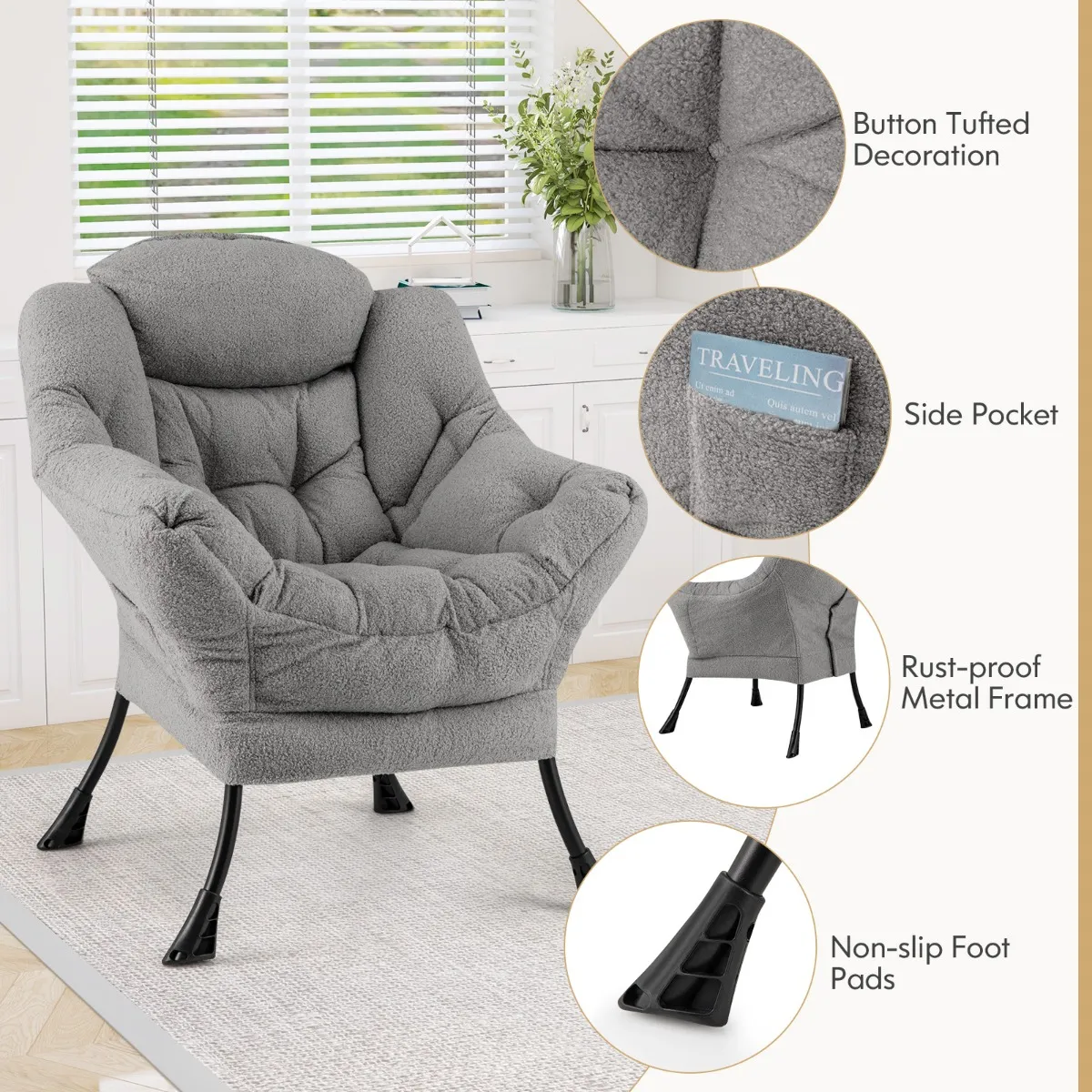 【Veelzijdig toepasbaar】: Dankzij de met knopen getufte decoratie en het eenvoudige kleurenschema zal de vrijetijdsstoel een bijzonder esthetisch stuk in je huis zijn. Hij kan veel gebruikt worden in de woonkamer, slaapkamer en thuiskantoor.