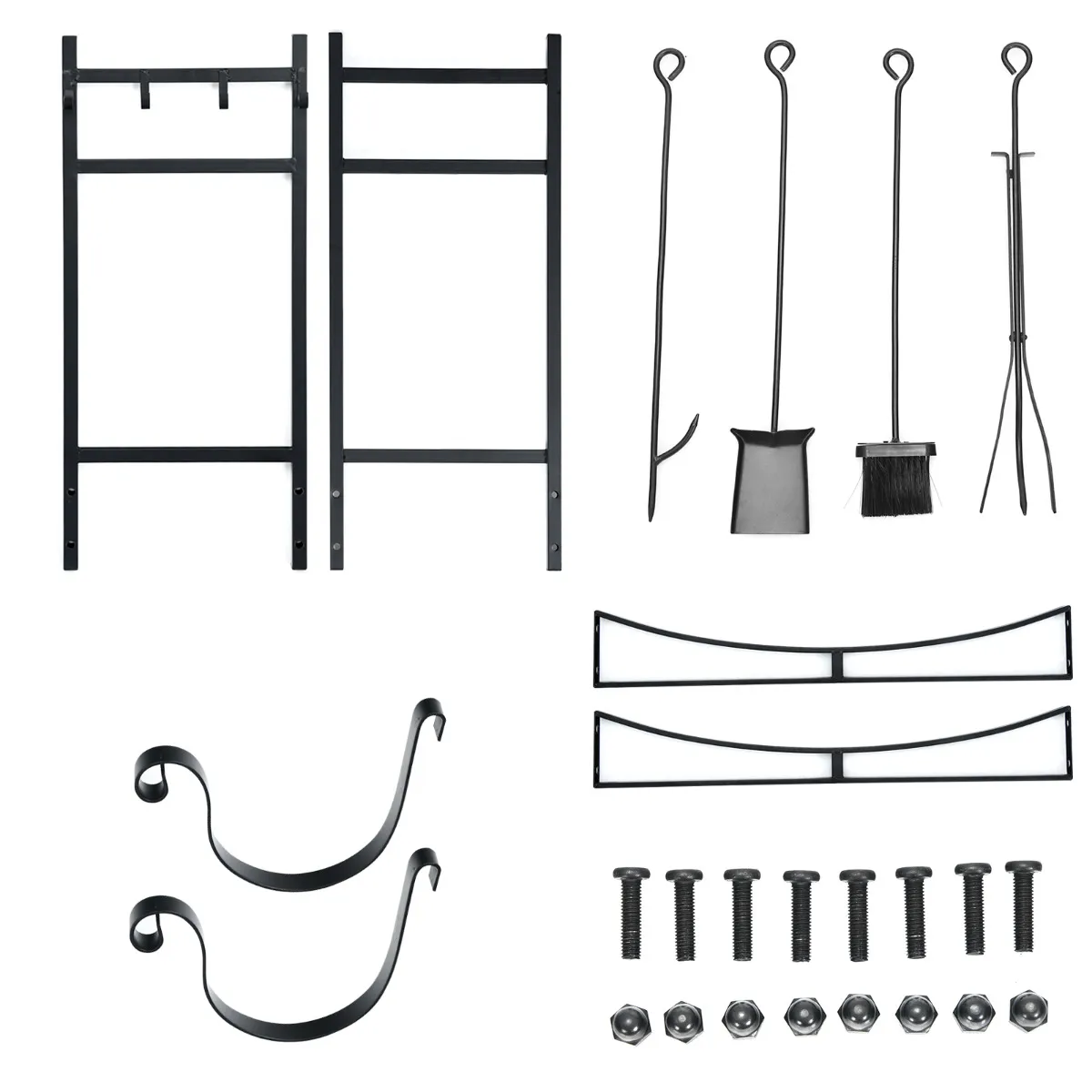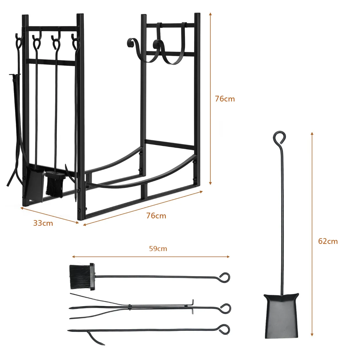 4 benodigde gereedschappen en luciferhouders: Er zijn 4 extra bijpassende gereedschappen, waaronder een schep, een borstel, een pookhaak en een tang. Alle accessoires kunnen aan de zijhaken worden opgehangen, wat woonruimte bespaart en een eenvoudige toegang garandeert.