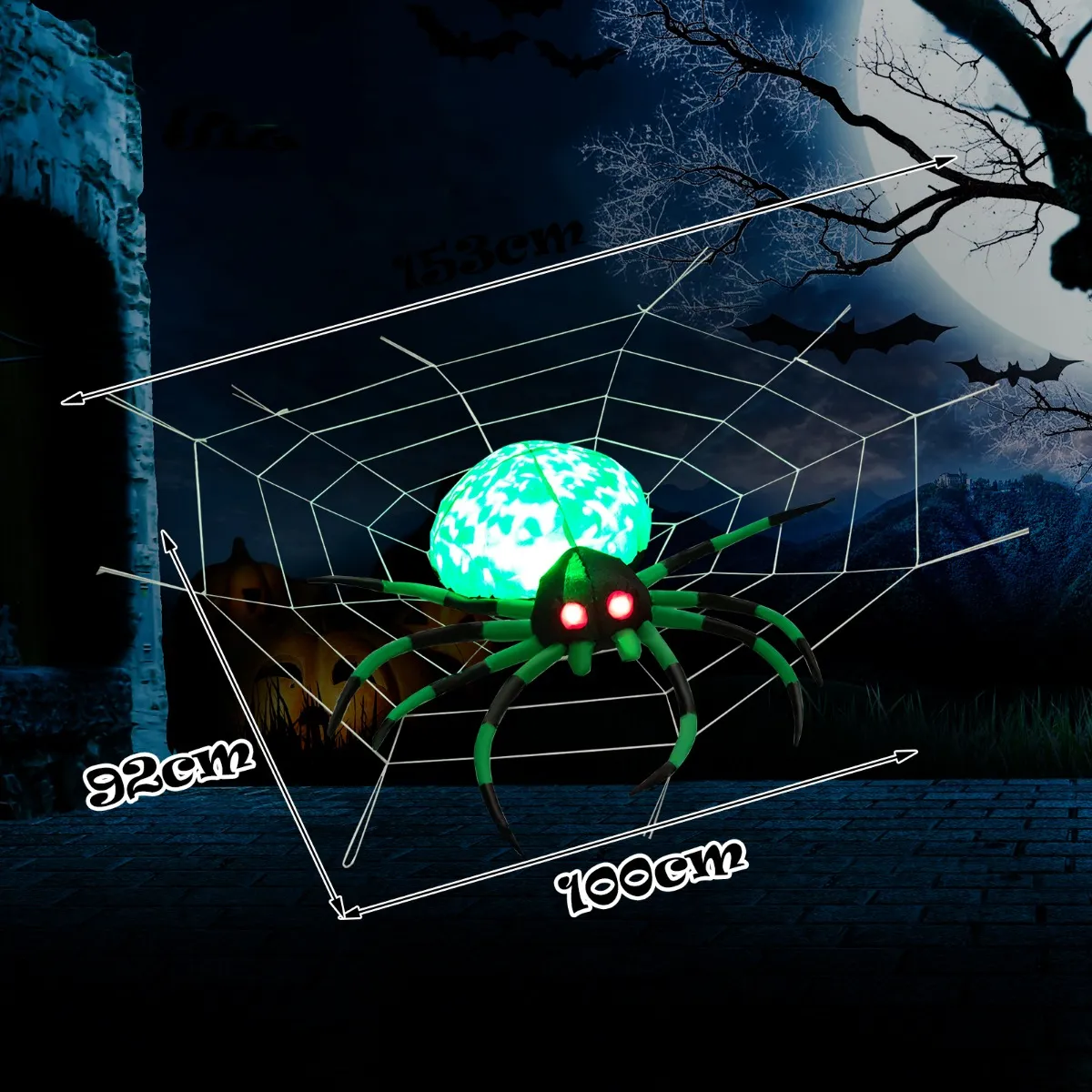 【Ingebouwde heldere en roterende lichten】 De opblaasbare spin van het spinnenweb ziet er levendiger uit met de ingebouwde coole roterende lamp, net als discolicht, dat niet alleen je tuin opfleurt, maar ook het horroreffect naar een hoogtepunt brengt. Haar ogen gloeien rood en schrikken je buren.