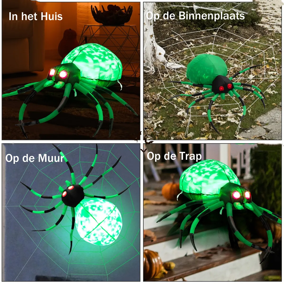 【Enge opblaasbare spin】Deze opblaasbare tuindecoratie is ontworpen met een grote spin en een gigantisch spinnenweb, waardoor het realistischer is. Bovendien schrikken de zwarte en groene lange benen en de angstaanjagende rode ogen kinderen en gasten die op trick-or-treat-avond komen.