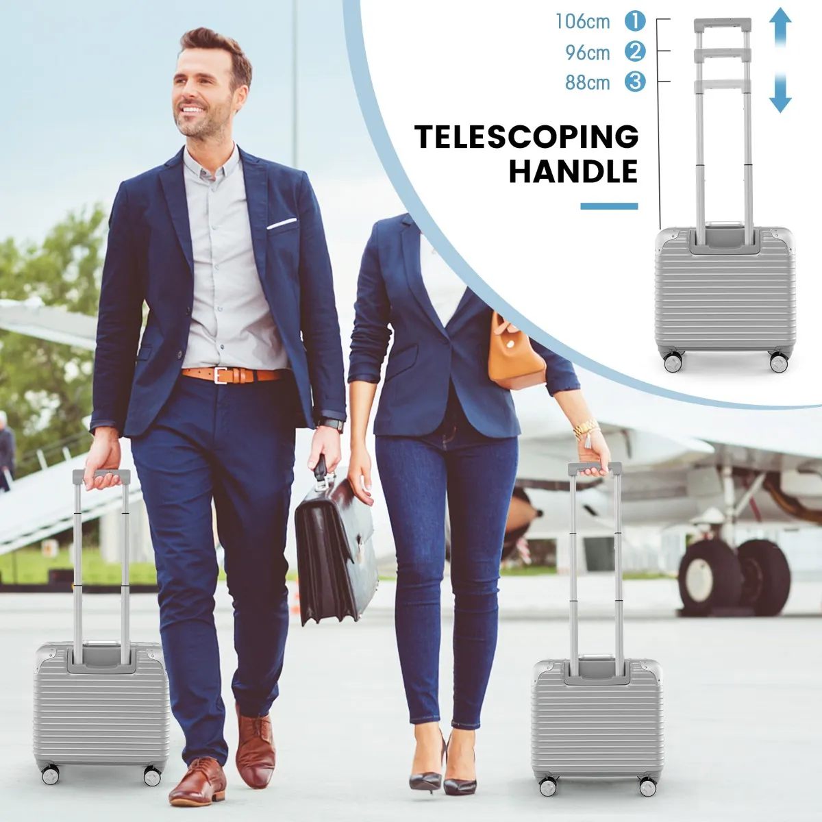 Juiste maat: Met een totale afmeting van 43 x 44 x 24 cm past de 16″ handbagage gemakkelijk over of onder de stoel. En de lichtgewicht reiskoffer weegt slechts 3,5 kg en is goedgekeurd door de luchtvaartmaatschappij.