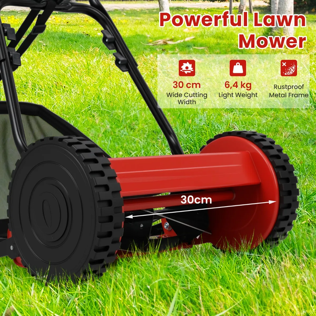 [Krachtige grasmaaier]: Onze grasmaaier heeft een maaibreedte van 30 cm, zodat brede grasstroken in één keer kunnen worden gemaaid, wat je snelheid en efficiëntie aanzienlijk verbetert. Bovendien geeft het roestvrije metalen frame de maaier duurzaamheid en zorgt ervoor dat hij bestand is tegen de tand des tijds en ruwe buitenomstandigheden.