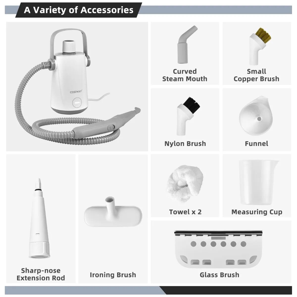 - Verpakkingsinhoud: 1 x Stoomreiniger1 x Glasborstel2 x Handdoeken1 x Koperen borstel1 x Nylonborstel1 x Verlengstuk met spitse neus1 x Gebogen mondstuk1 x Trechter1 x Strijkborstel1 x Maatbeker1 x Gebruiksaanwijzing