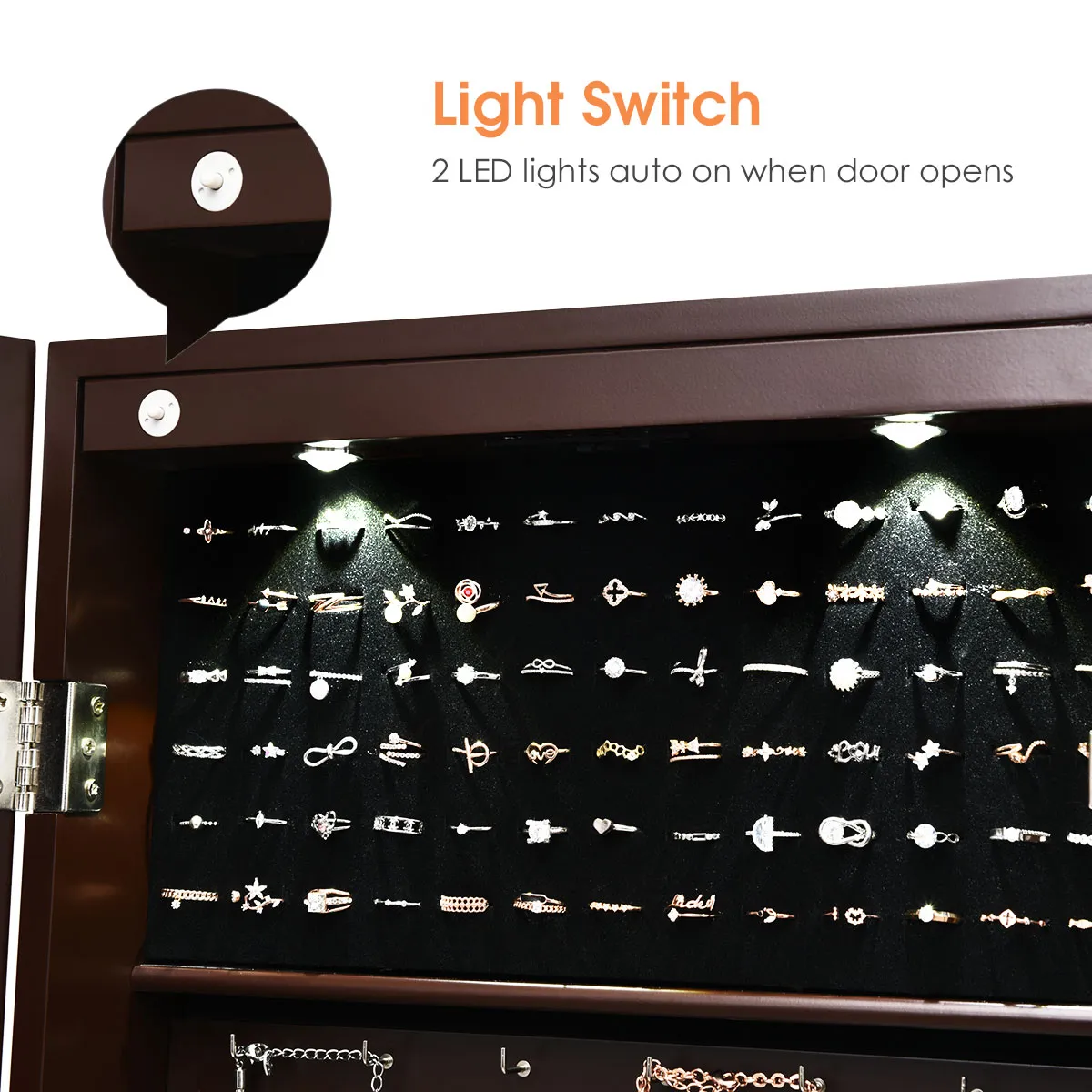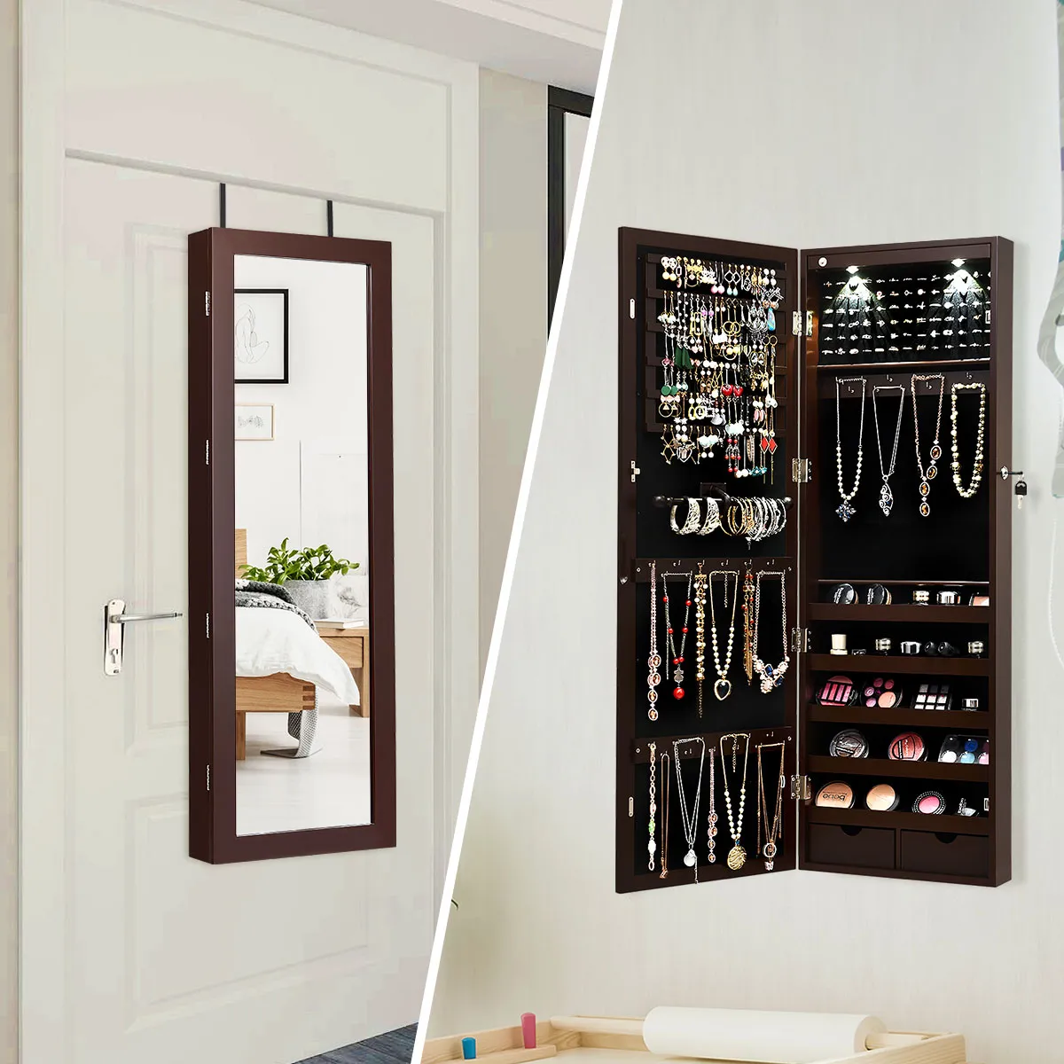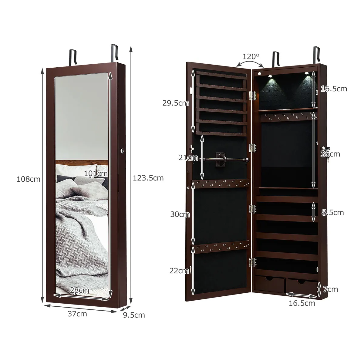Deze hangende sieradenkast kan zowel aan de muur als aan een deur worden gemonteerd en is voorzien van een heldere full-body spiegel, waardoor je moeiteloos je outfit kunt controleren. Dankzij de interne LED-verlichting kun je je sieraden zelfs bij weinig licht eenvoudig bekijken en organiseren. Â