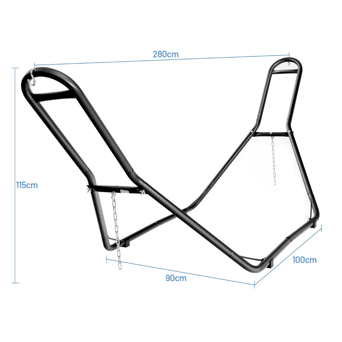 Met 2 verstelbare kettingen en 2 S-vormige haken is hij compatibel met verschillende hangmatten. Het hoogwaardige staal maakt het weer- en roestbestendig, waardoor het lang meegaat. Het is daarom uitstekend geschikt voor terrassen, tuinen en veranda’s. Het metalen frame zorgt voor zijn betrouwbaarheid en draagvermogen van 150 kg en is ook zeer stabiel dankzij de kunststof onderzetters die de vloer beschermen. Door het lichtgewicht en praktische ontwerp kun je hem overal mee naartoe nemen. Dankzij de gedetailleerde instructies en de meegeleverde accessoires is de montage ook snel en eenvoudig.