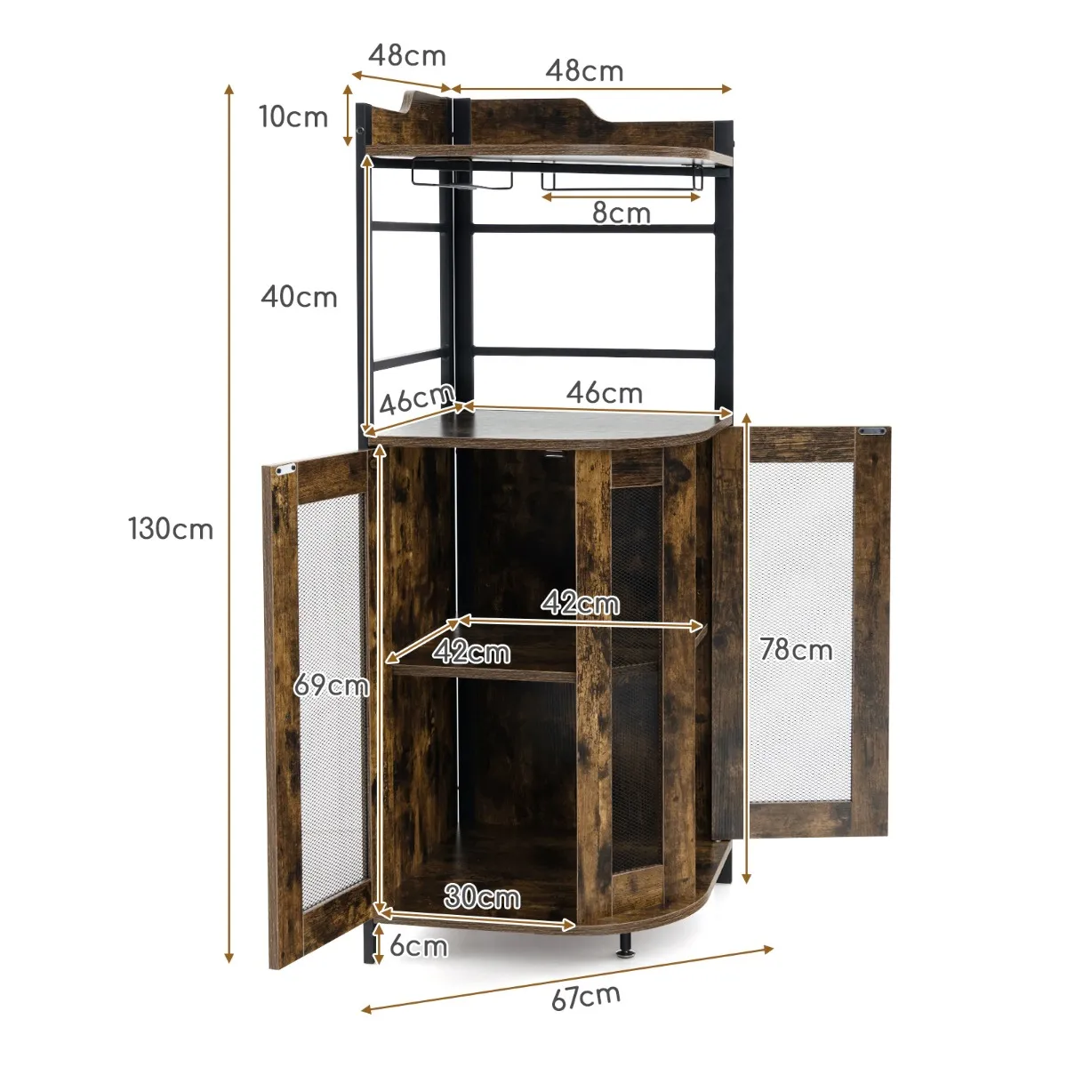 Deze stijlvolle wijnkast ruimt rommel op en verandert een onopvallend hoekje in een prachtige thuisbar. De bovenste plank heeft 2 glazenhouders voor het opbergen van breekbaar glaswerk, waardoor het praktisch is om op elk moment een glas te pakken. En de onderste kast met geventileerde gaasdeuren biedt veel opbergruimte. De plank binnenin kan naar wens worden aangepast of verwijderd. Natuurlijk is een stevige constructie essentieel om de lading te dragen. Naast het hoogwaardige materiaal is de hoekbank uitgerust met een anti-kantelset en een verstelbare voetensteun om de stabiliteit te vergroten.