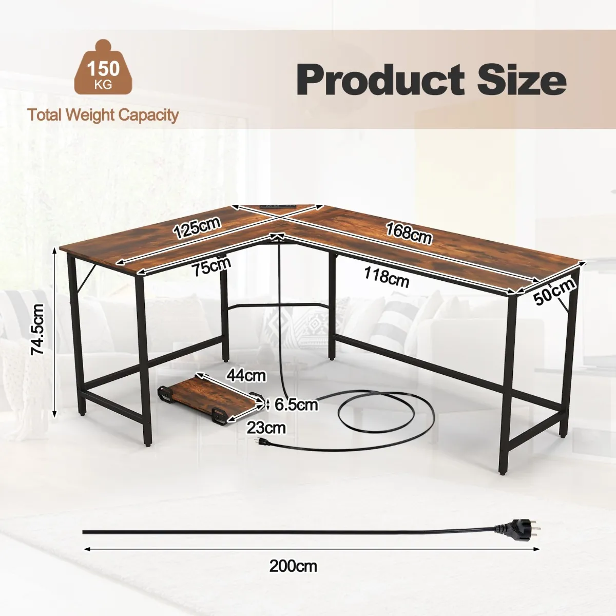 Hoekbureau Met Stopcontact 168 Cm Bureau Met CPU-Houder Stevig Metalen Frame Studiebureau Ruimtebesparende Computertafel-Bruin