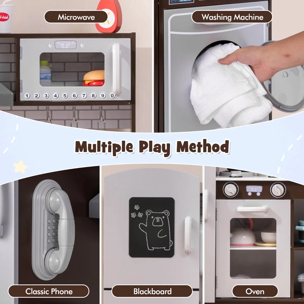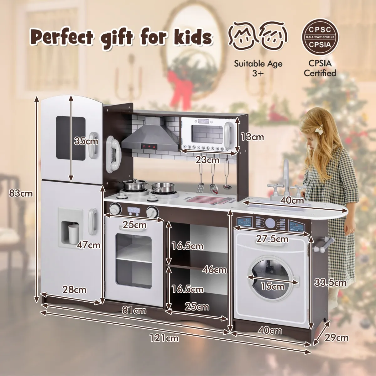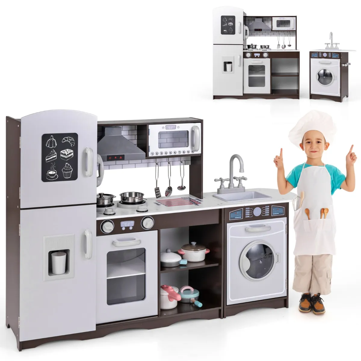 Onze speelkeuken ziet eruit als een echte, moderne keuken, met kookgerei op kinderformaat. Er zijn verschillende speelruimtes, waaronder een oven, koelkast, magnetron, fornuis, gootsteen, telefoon, schoolbord en een wasmachine met dubbele deur, zodat de boel op een speelse manier opgeruimd kan worden. De lichten en geluiden van de afzuigkap, klikkende knoppen, draaiende kranen en werkende ijsblokjesmachine zorgen voor een authentieke keukenervaring. Deze speelset is gemaakt van stevig, kindveilig hout en garandeert langdurige veiligheid.