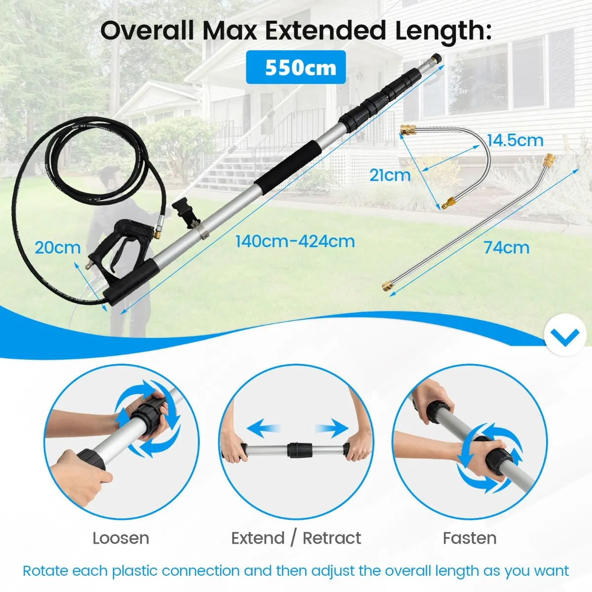 【5-delige telescopische uitbreiding】 Met deze 5-delige telescopische uitbreiding kunnen moeilijk bereikbare plekken volledig gereinigd worden. Draai gewoon aan de vergrendelingshulzen en trek elke sectie uit. Met een verlenging van 15° en een opzetstuk voor dakgootreiniging kan het apparaat tot 215-550 cm reiken.